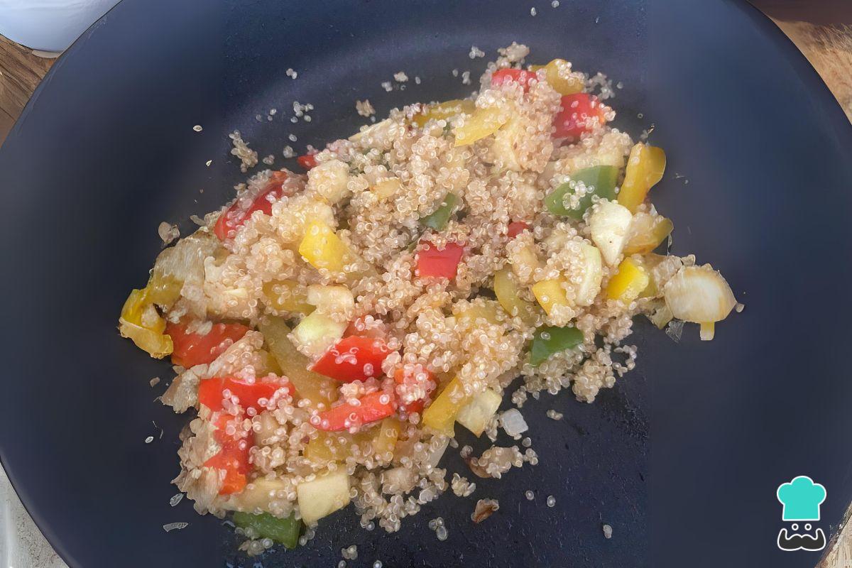 Después de preparar todos los ingredientes lava la quinoa con especial atención para eliminar la saponina, que es una sustancia que puede dejar un sabor amargo a esta semilla una vez cocinada. Una vez hecho, calienta la quinoa hasta el momento en el que empiece a hervir. Ahí tapa la cazuela y cocina a fuego medio durante 12 minutos aproximadamente o, hasta que el líquido se consuma.