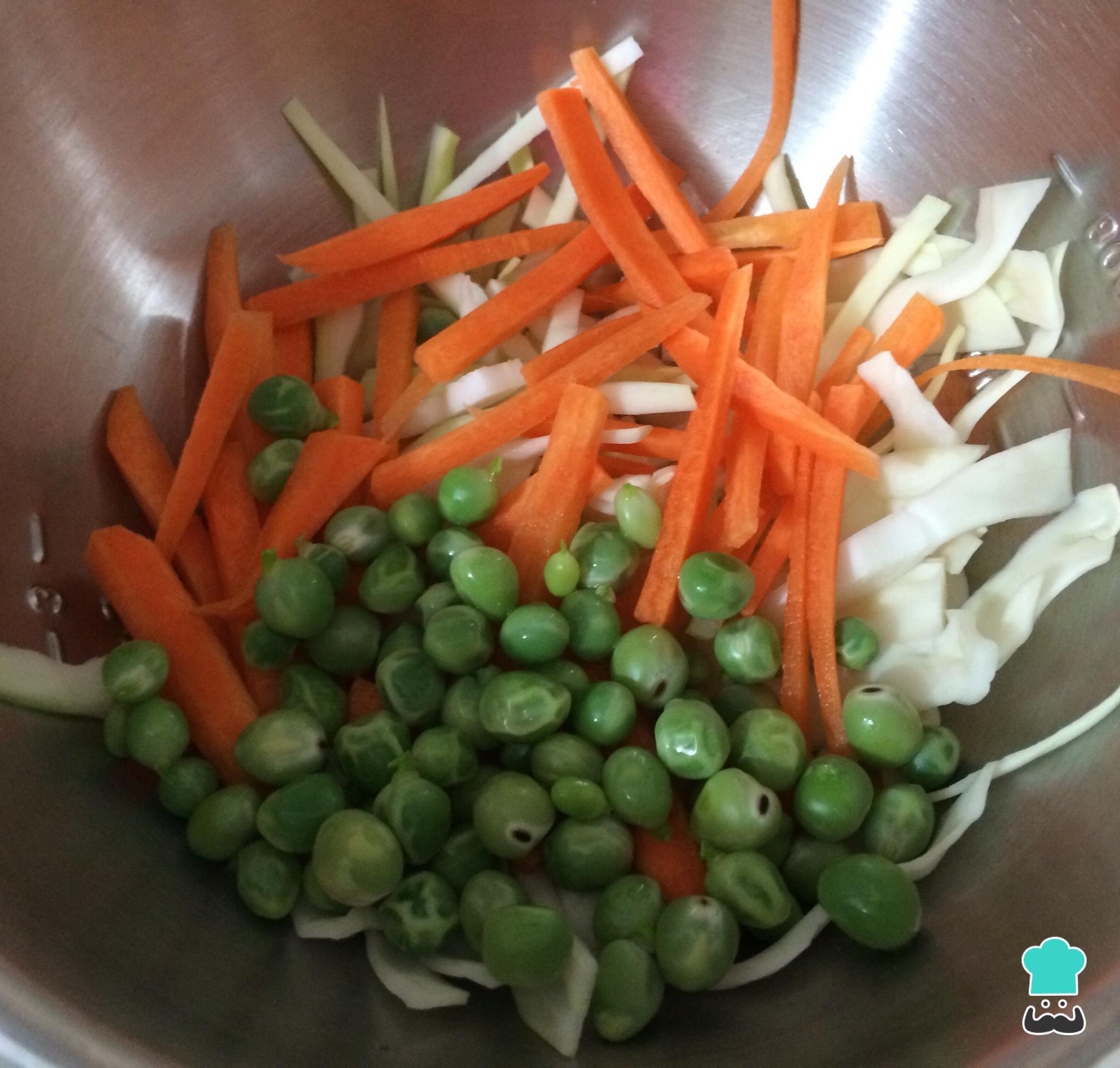 En un bowl añadir la zanahoria y el repollo cortados en tiras delgadas, los guisantes cocinados, mezclar.