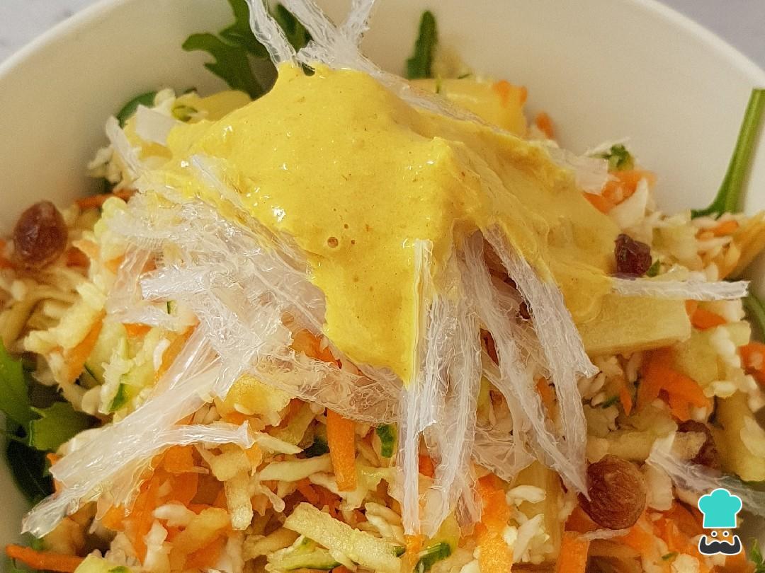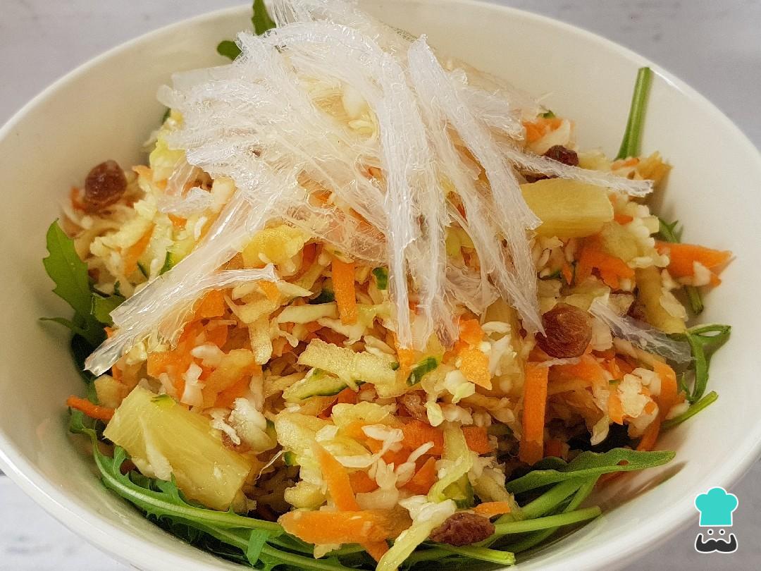 Esta ensalada de col y zanahoria rallada es una versión veraniega y fresca de la clásica ensalada de col americana. Es perfecta para servir en un almuerzo o cena como plato principal o como una guarnición. Vamos a darle un toque tropical, dulce y frutal añadiendo piña, manzana y pasas y la vamos a servir con una deliciosa salsa de piña para sustituir la mayonesa que ayudará a crear una rica combinación de sabores. Sigue leyendo y descubre en RecetasGratis cómo hacer ensalada de repollo y zanahoria sin mayonesa.