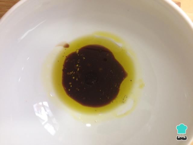 Preparamos un aliño con el aceite de oliva, el vinagre balsámico, un poco de sal, una pizca de azúcar blanco y un poco de pimienta negra molida.