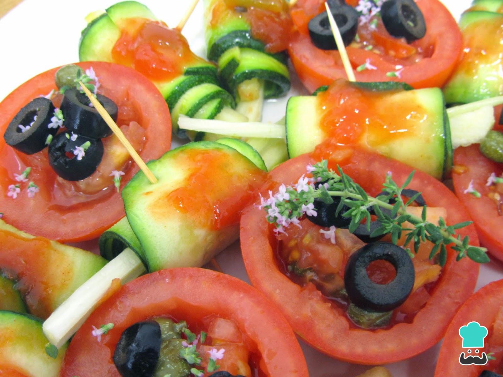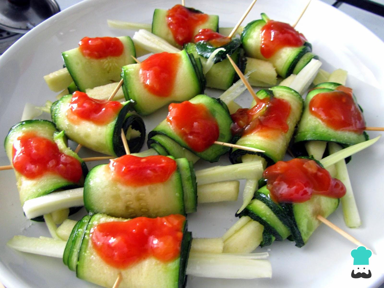 Para hacer los rollitos, une un bastón de apio y otro de manzana y envuelve con una lámina de calabacín. Pincha con un palillo de madera para que no se abra.