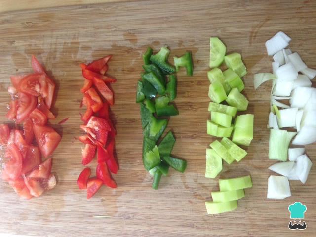 Troceamos todas las verduras tal y como se ve en la imagen. Recordad que es necesario pelar el pepino.