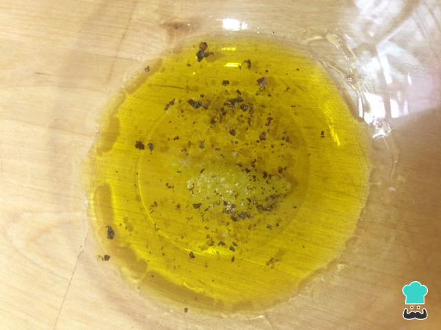Por otra parte preparamos un aderezo con 3 cucharadas de aceite de oliva, una pizca de sal, una pizca de pimienta negra y una cucharada de limón.