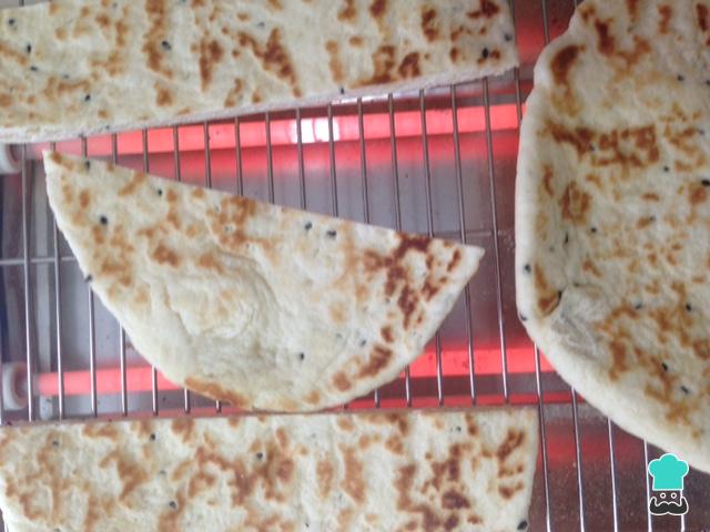 Mientras tanto, tostamos el pan de pita en la tostadora hasta que quede tierno. Lo retiramos y cortamos en pedacitos o en tiras.