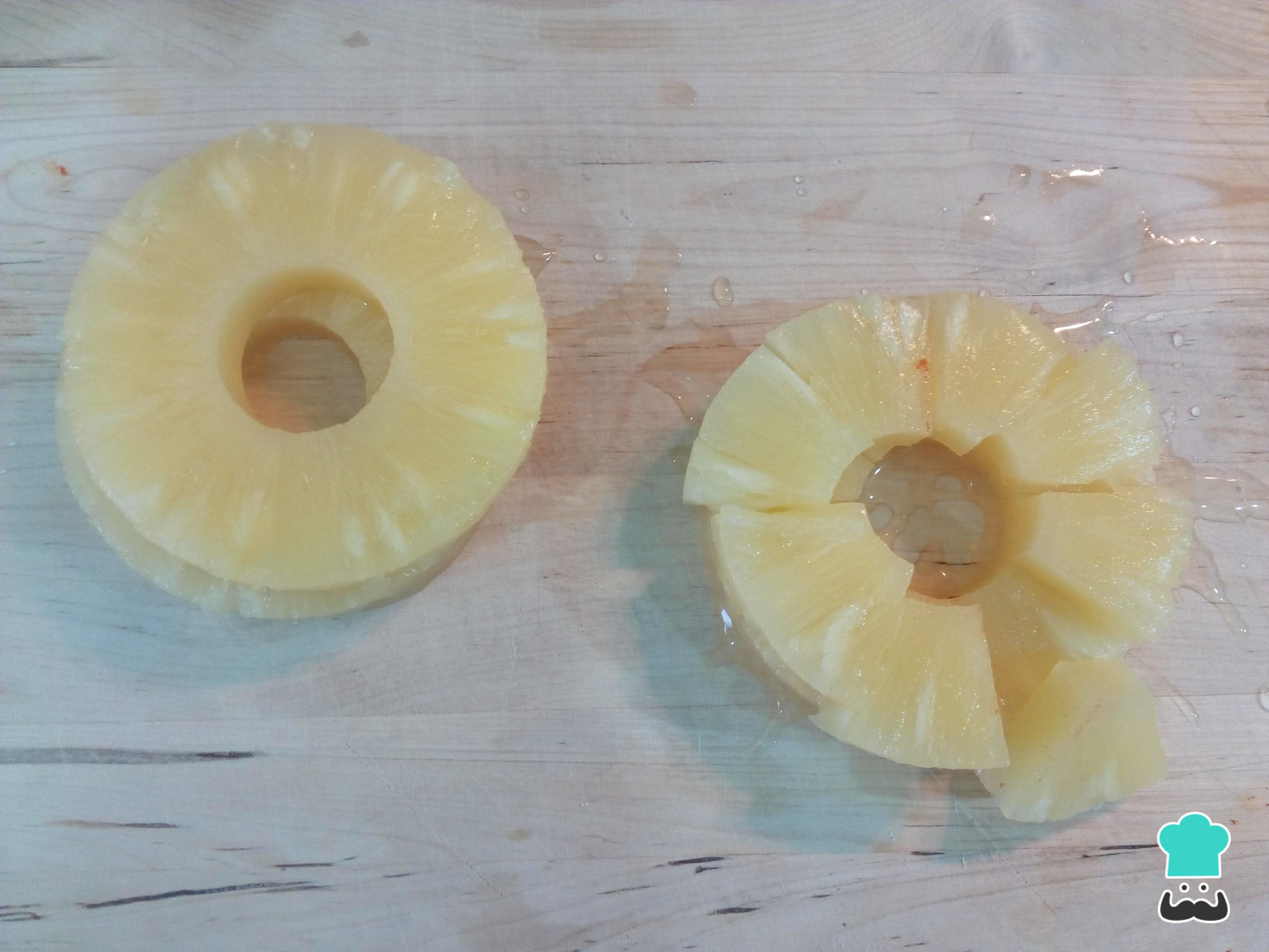Mientras se cuece la pasta preparamos el resto de ingredientes de la ensalada de coditos para Navidad. Primero escurrimos la piña en almíbar pero reservamos el juego para después, y la cortamos en trozos más pequeños o incluso en dados. Entonces la colocamos en un bol grande o ensaladera.
