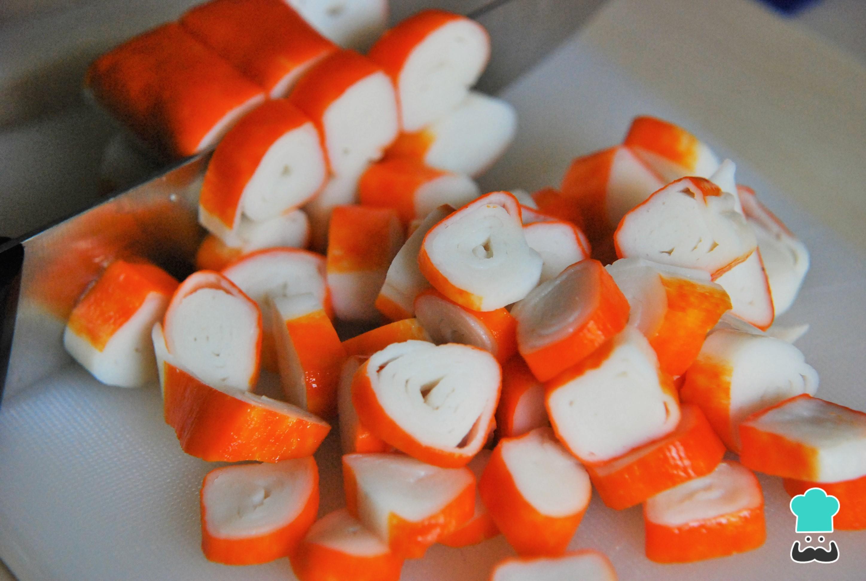 Continuamos con el surimi, nombre que se le da a las barritas de cangrejo preparado. Córtalas en rodajas finas y si te gustan mucho puedes usar más de tres para preparar esta ensalada verde de atún.