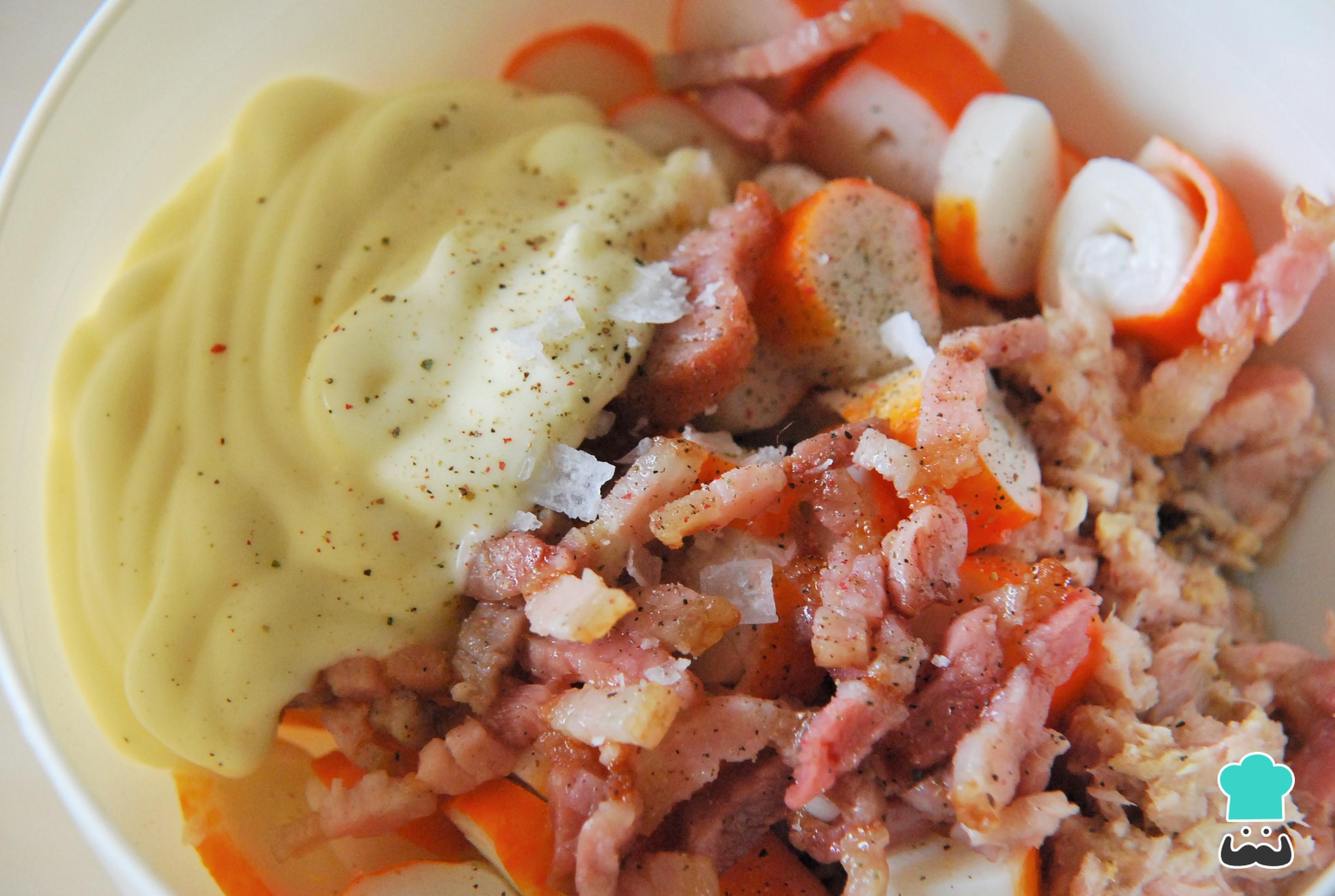 Ahora mezcla todos los ingredientes que hemos preparado hasta ahora junto con la mayonesa y un poco de sal y pimienta al gusto. Mezcla bien para que se integre todo y corrige la sazón si es necesario y reserva en la nevera. Esta mezcla será el componente principal de nuestra ensalada de atún y surimi.