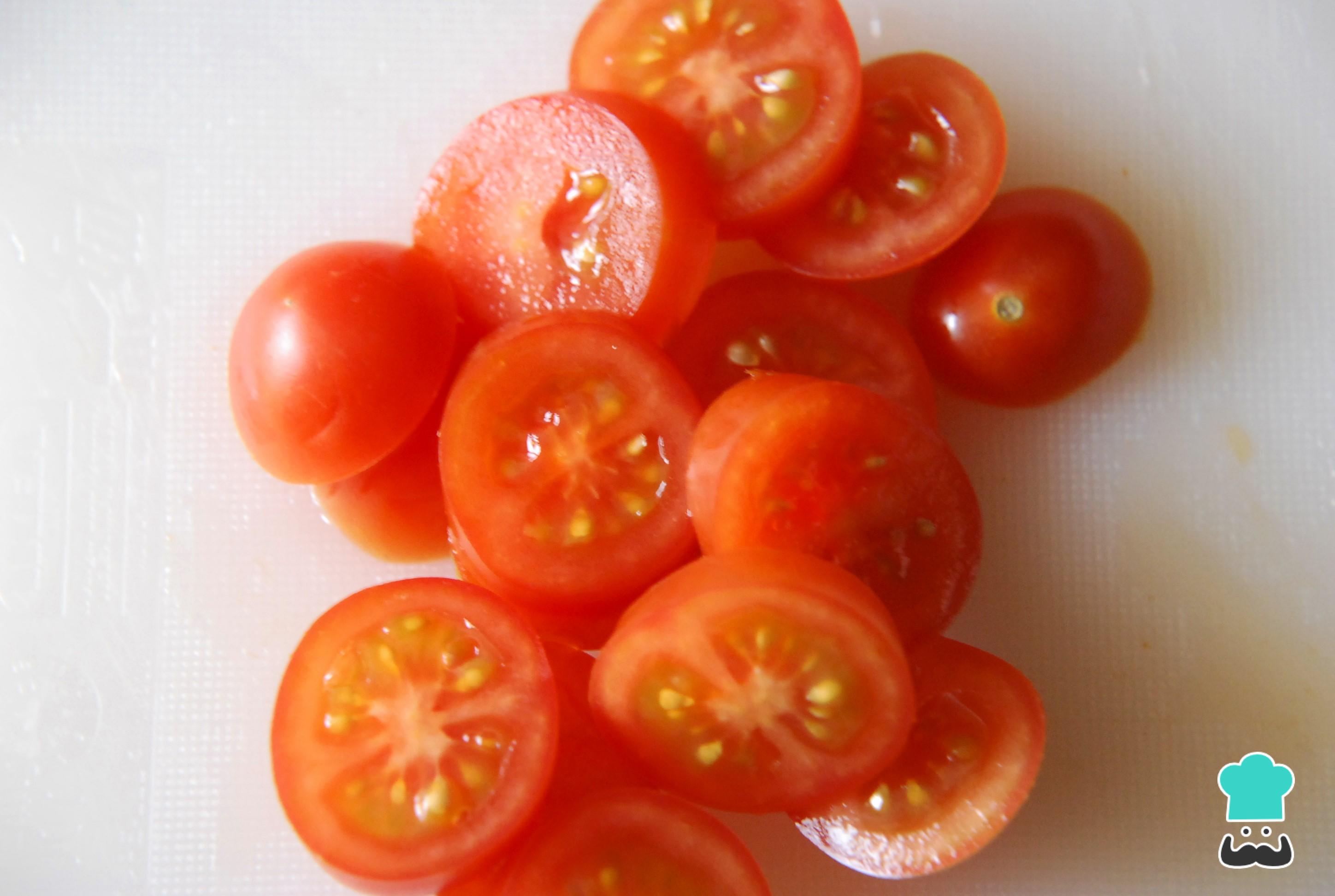 Aparte, ve cortando los tomates cherry en rodajas. Yo he utilizado esta variedad de tomate para la ensalada verde de atún pero puedes utilizar cualquier tipo de tomate.