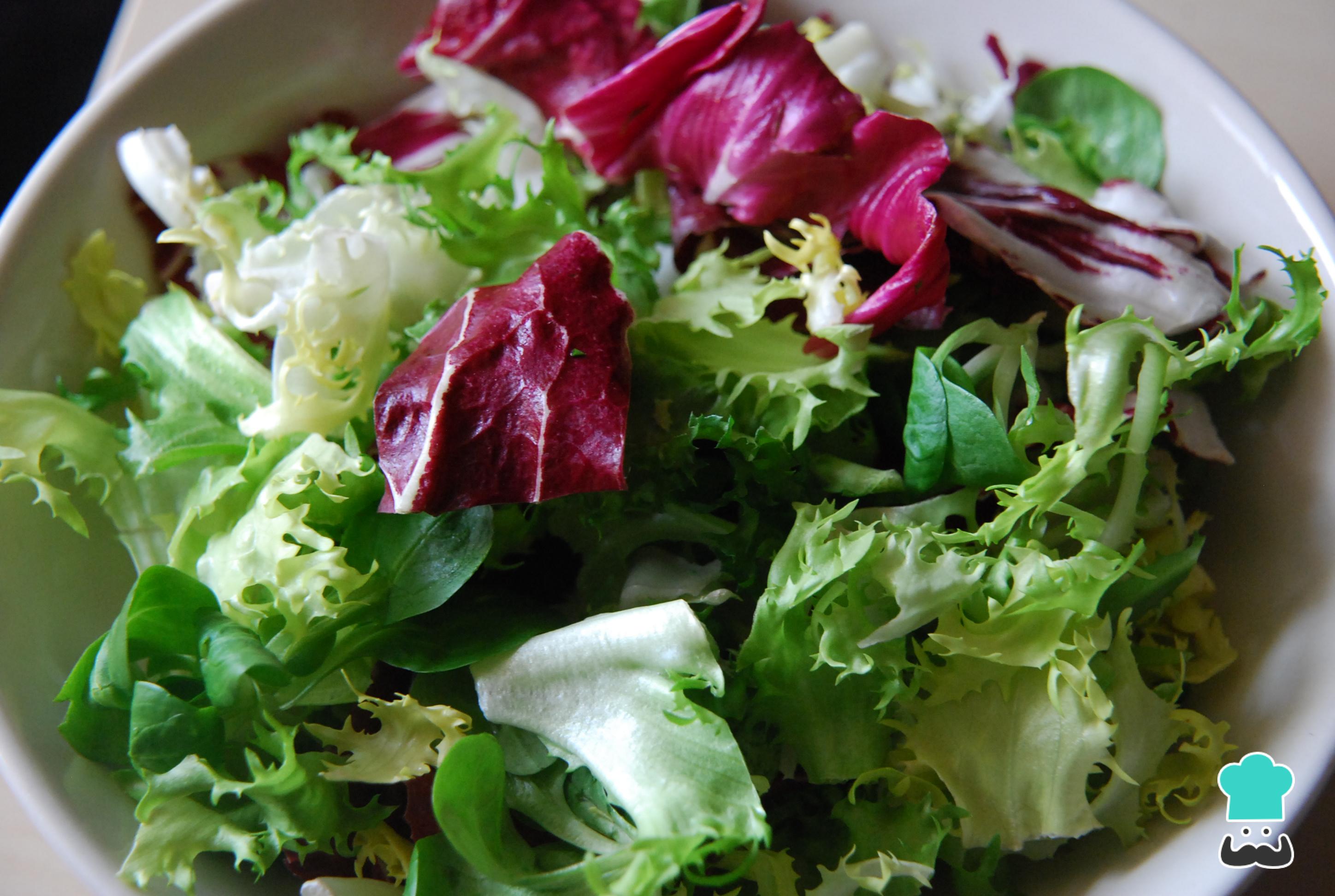 La base de ensalada es la parte verde. En los ingredientes verás que dice 'mezcla verde para ensaladas', esto es porque muchos supermercados venden bolsas ya listas que contiene varios tipos de hojas y lechugas. Yo he utilizado escarola rizada, lechuga morada y canónigos pero puedes utilizar la hortaliza de tu preferencia.