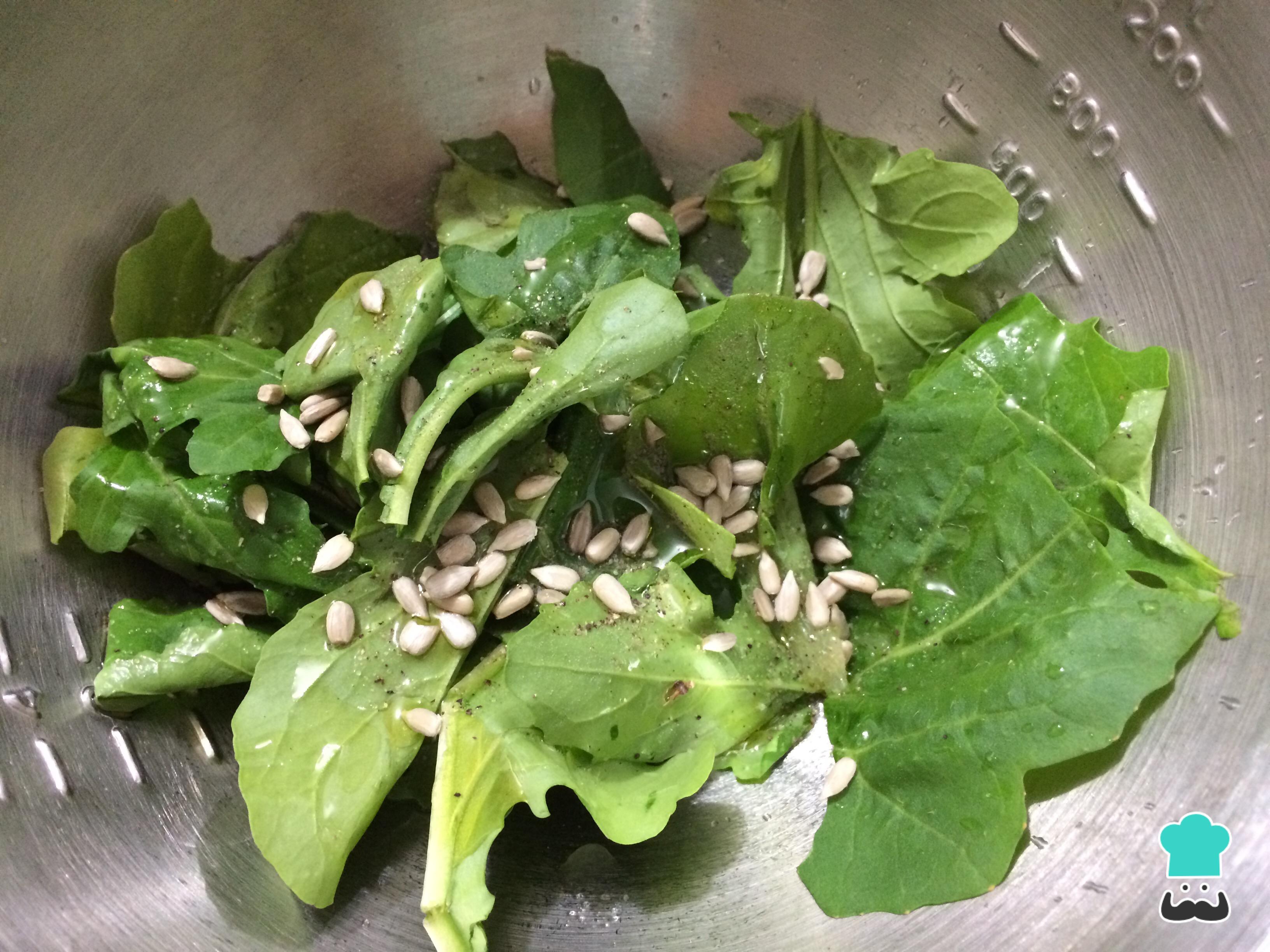 Para hacer el mezclum de la ensalada, lleva a un bol la rúgula cortada en trozos, con las semillas de girasol, el zumo del limón, el aceite de oliva, sal, pimienta y una pizca de azúcar.