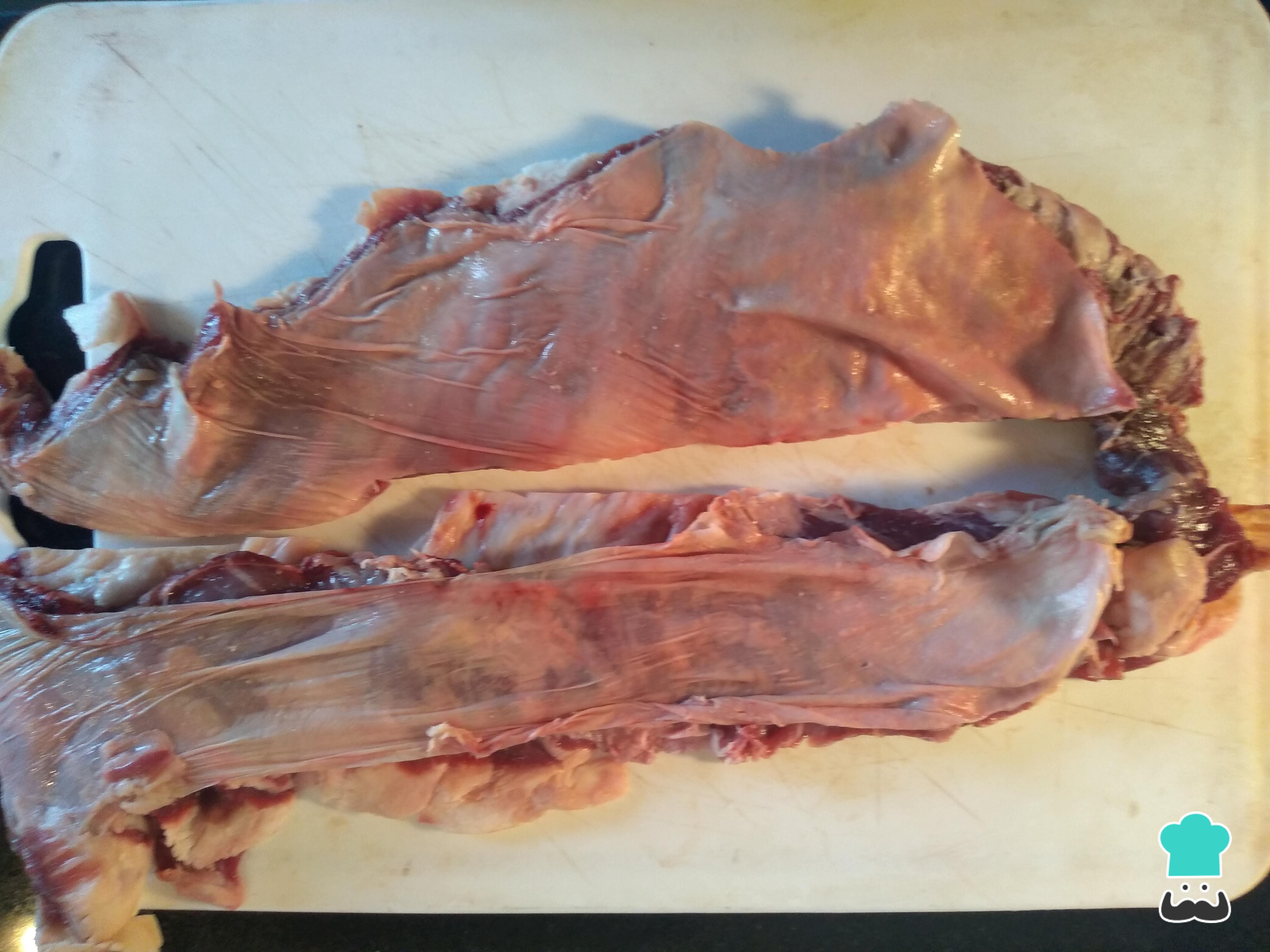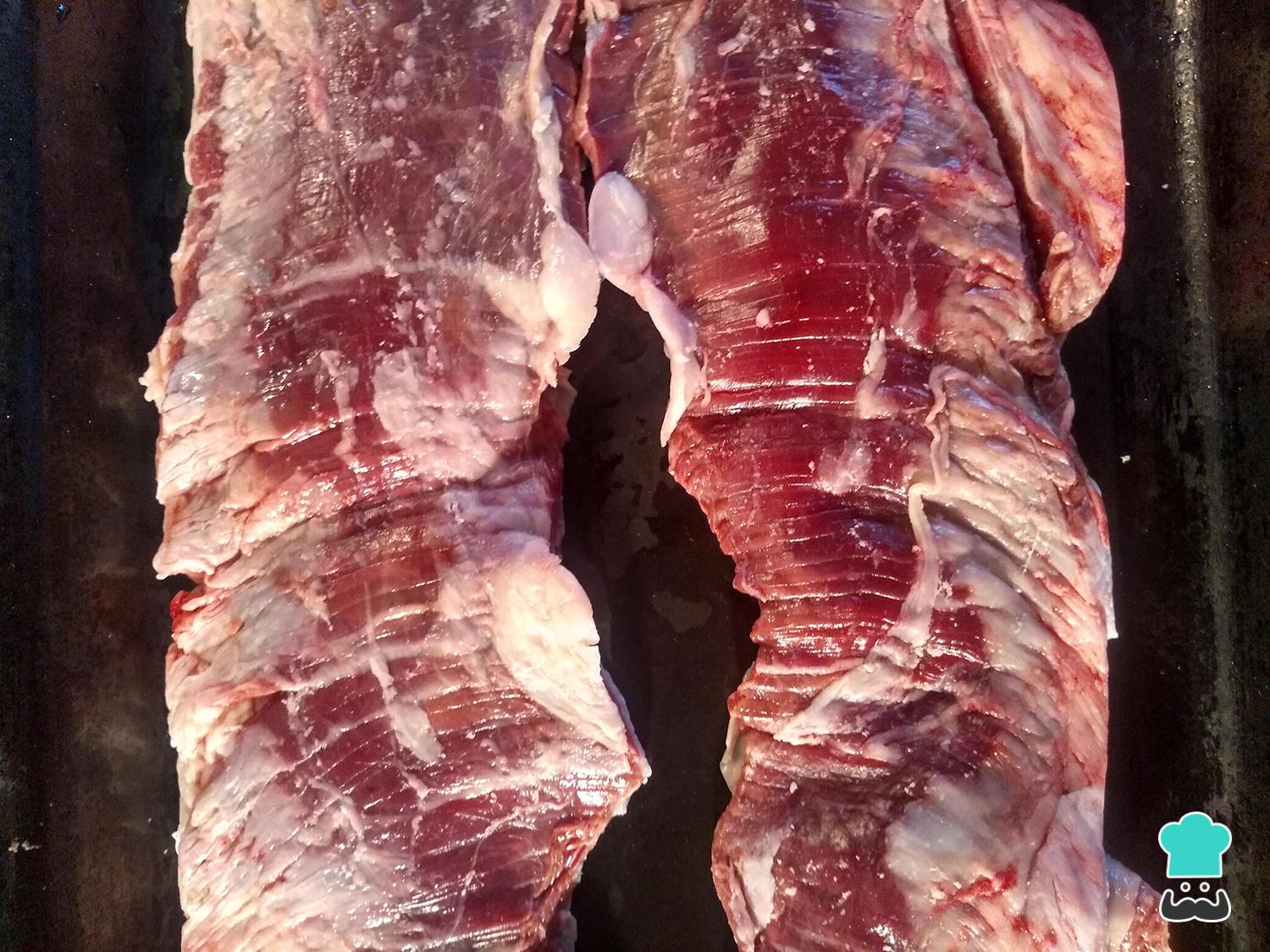 La entraña es un músculo que recorre internamente el costillar de la vaca, lo que vendría a ser el diagrama del animal. Si bien es muy tierna, tiene un tejido cartilaginoso que en la cocción puede a llegar a quedar muy duro y se ve a simple vista. Se puede dejar o quitar antes de la cocción, que es lo más recomendable, ya que se hace de una manera muy sencilla: solo hay que ir tirando del mismo tejido cartilaginoso, mientras sostienes la carne firmemente contra la tabla de cocina.