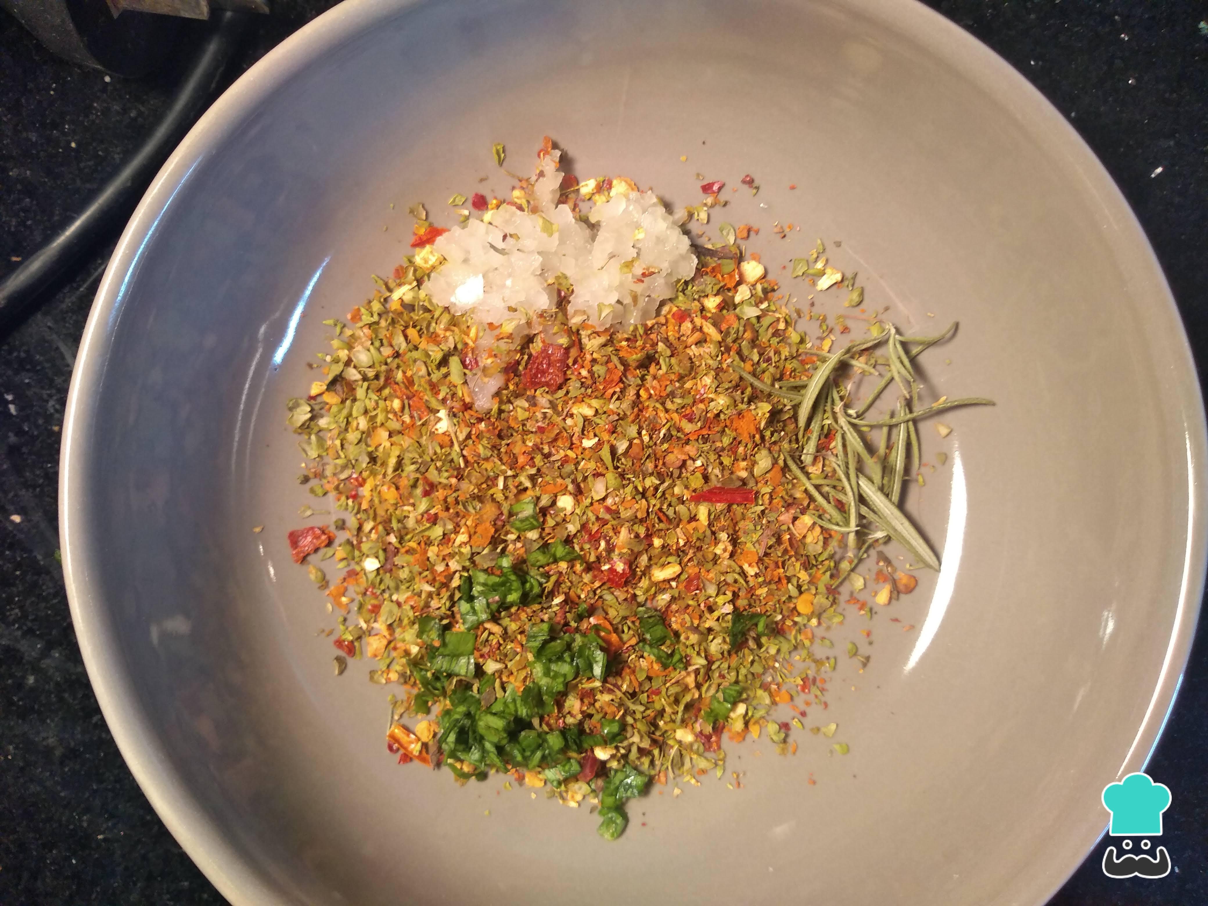 Mientras la entraña está en el horno, prepara la salsa chimichurri. Para ello, en un bol mezcla el orégano seco, el ají molido, el pimentón, el perejil picado, el romero y el diente de ajo picado.