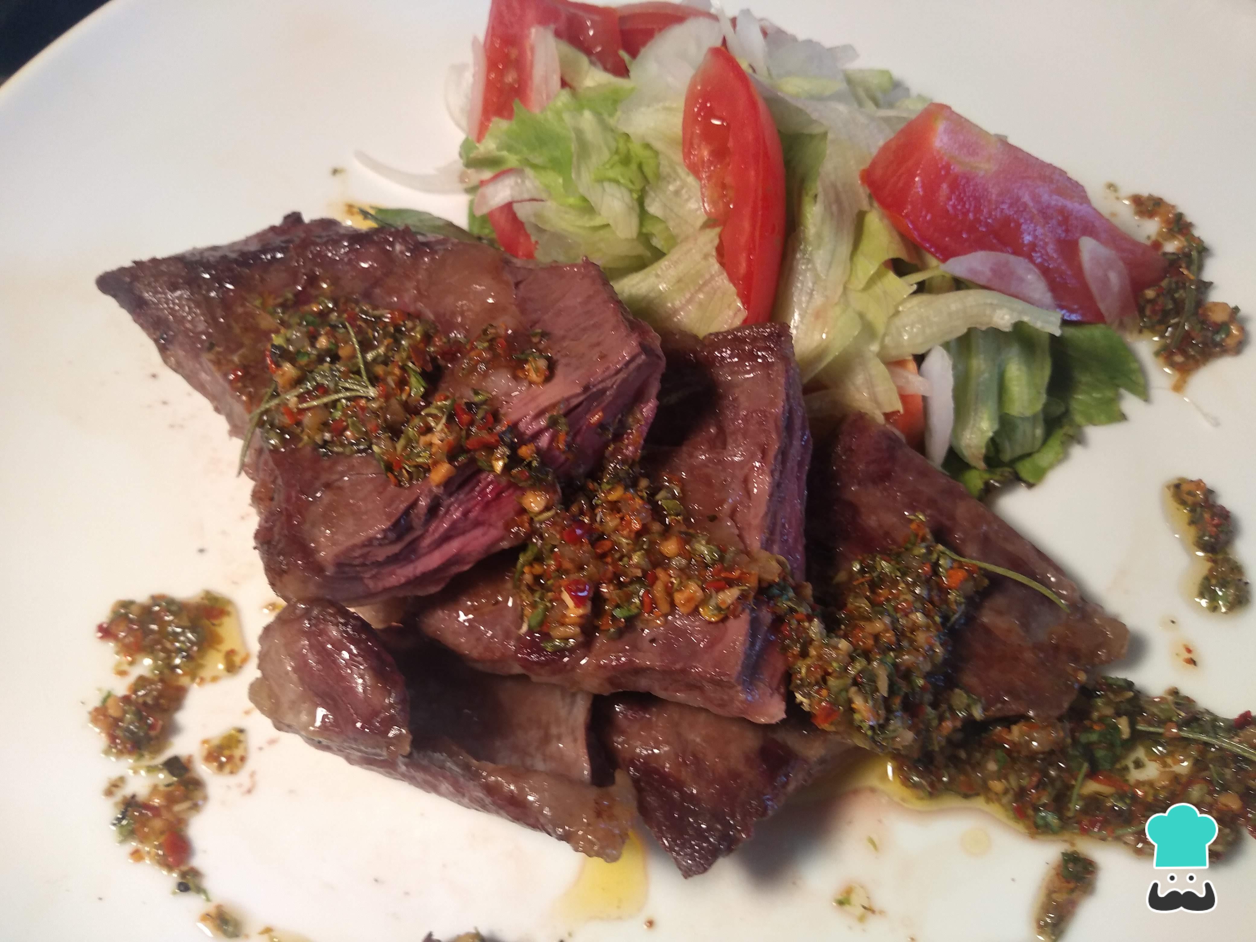 Esta entraña al horno es una receta sumamente fácil, económica y de muy rápida preparación. Si bien es una preparación sencilla, vamos a elevar la paleta de sabores con una salsa muy típica en Argentina para acompañar carnes, la salsa chimichurri. Es una salsa de consistencia líquida pero muy condimentada, sin llegar a ser muy picante, lo cual dependerá del ají molido que uses para la preparación.