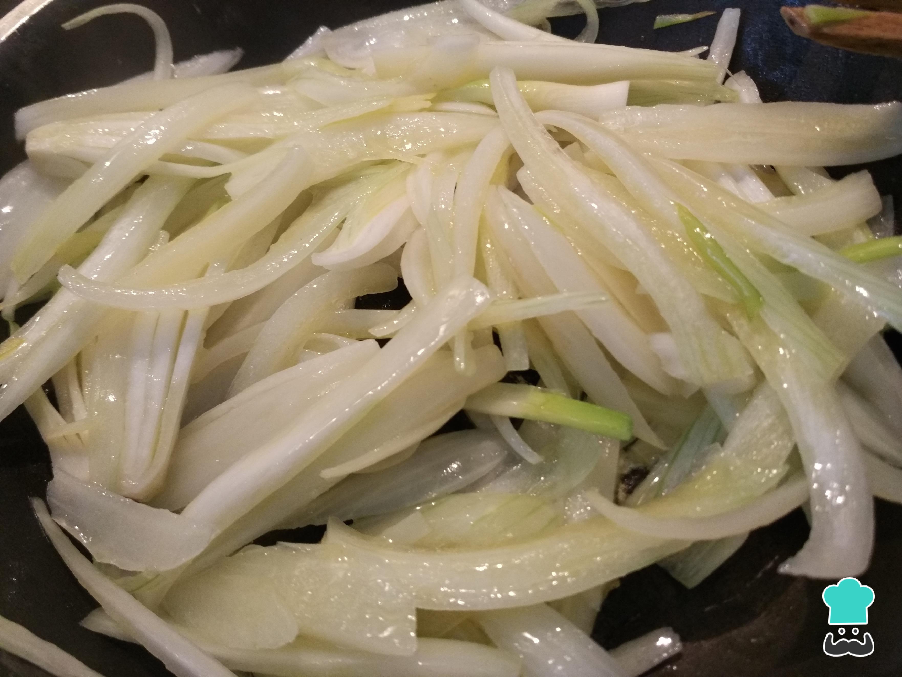Una vez que hemos reunido todos los ingredientes para preparar el entrecot con cebolla caramelizada, cortamos la cebolla en juliana y la cocinamos en una sartén junto con 3 cucharadas de aceite de oliva.
