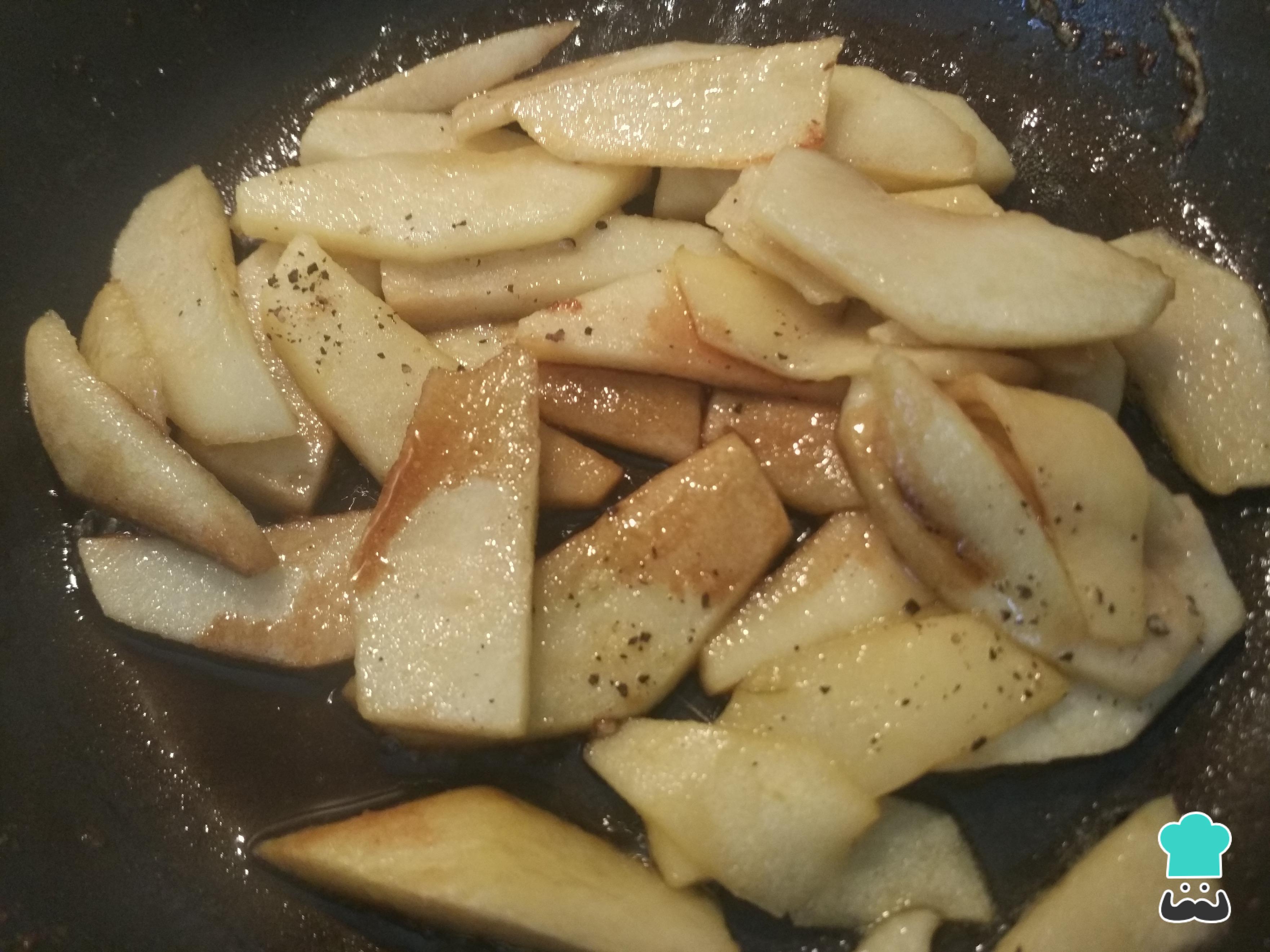 Mientras se prepara la cebolla caramelizada, vamos a preparar unas manzanas salteadas con mantequilla para acompañar al entrecot. Para ello, pelamos la manzana, la cortamos en rodajas y la salteamos en la sartén con una cucharada de mantequilla.