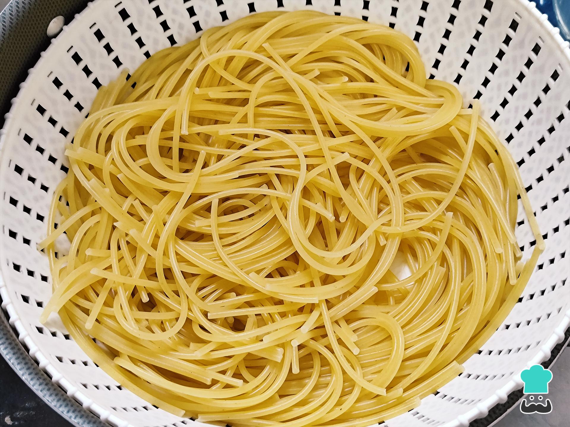 Cocina la pasta de espagueti en agua hirviendo con un poco de sal hasta que esté al dente. Luego, escurre y reserva.