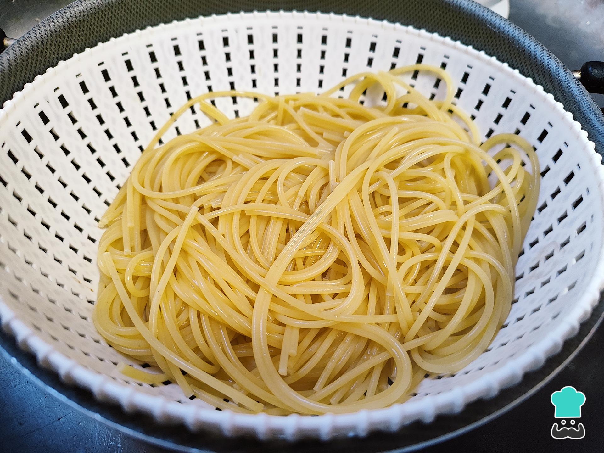 Comienza por cocinar la pasta. Asimismo, hierve suficiente agua con un poco de sal y cocina según el tiempo indicado en el paquete. Luego, escurre la pasta y reserva.