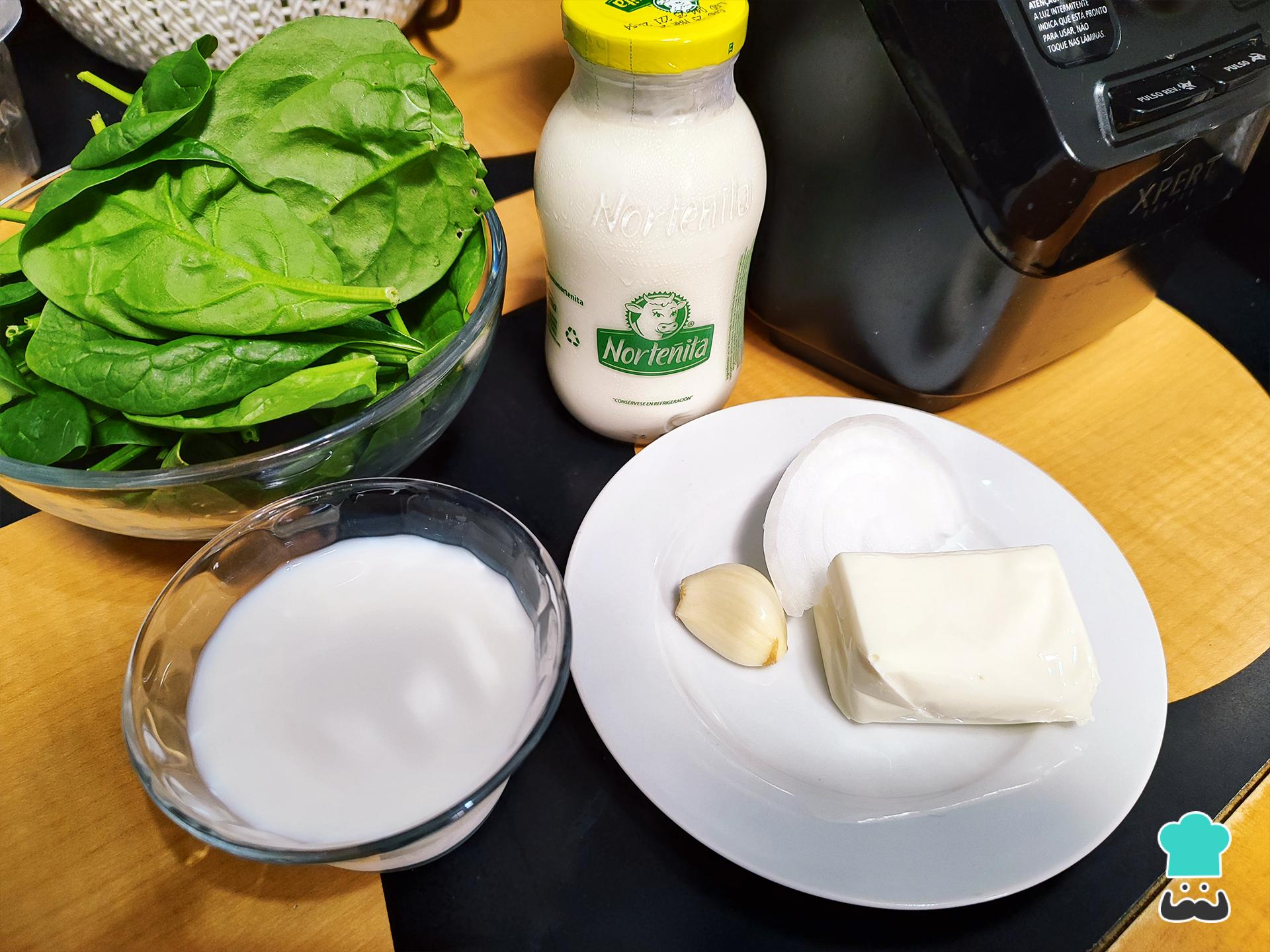 En la licuadora agrega la espinaca, la crema, la leche, la cebolla, el ajo y el queso crema, licúa los ingredientes hasta obtener una mezcla homogénea.
