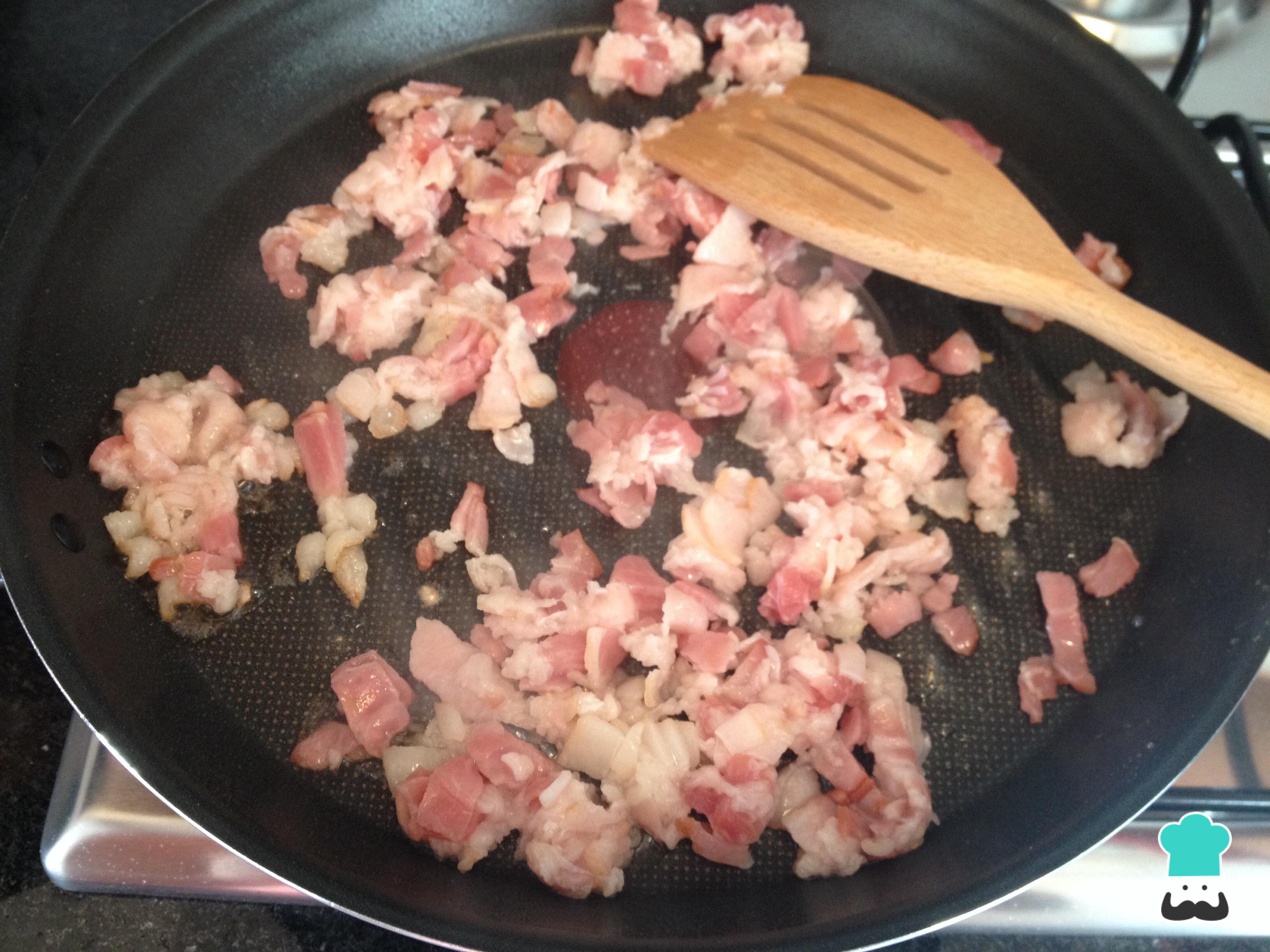 En una sartén disponer la tocineta cortada finamente hasta que esté dorada y suelte su grasa.