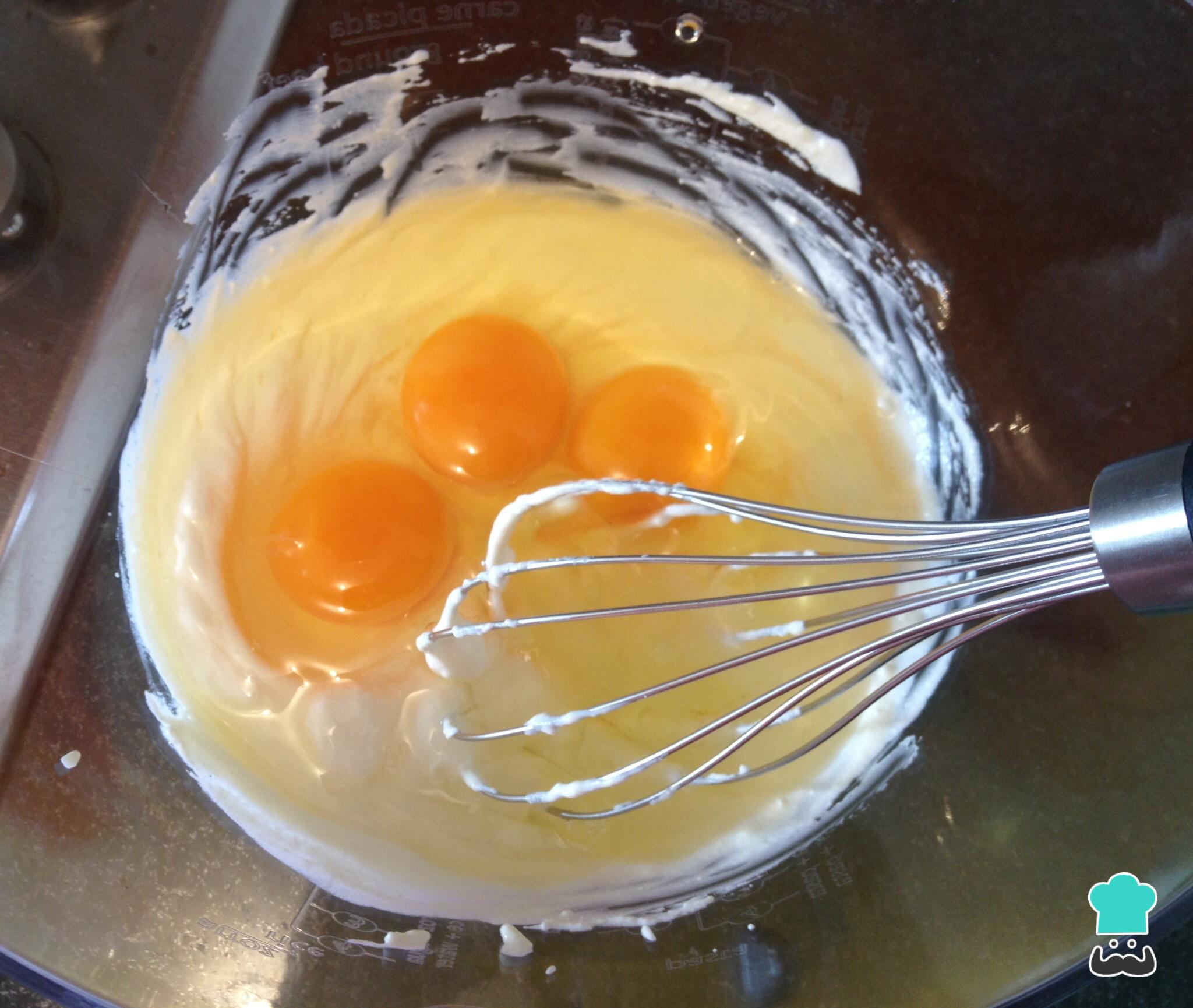 Aparte, mezclar la crema de leche y los huevos, salpimentar.