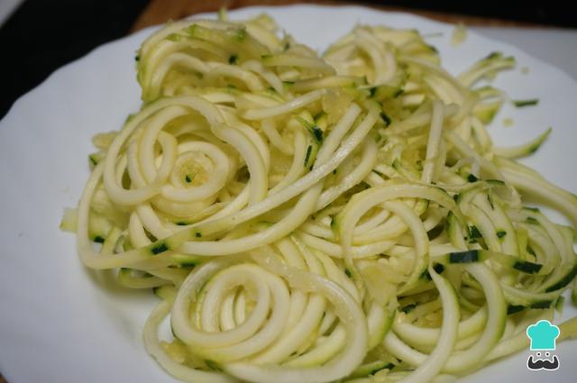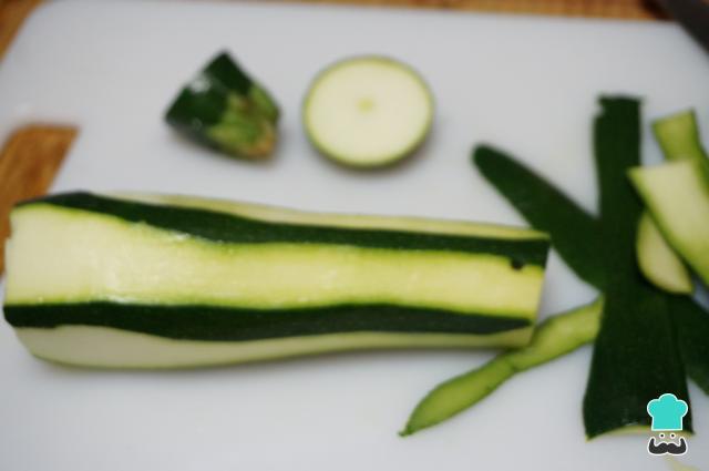 Con la máquina o con un cuchillo, corta tiras muy finas para formar los espaguetis de calabacín. Recuerda que puedes hacer tiras más anchas con el pelapatatas y, después, cortarlas más finas con un cuchillo.