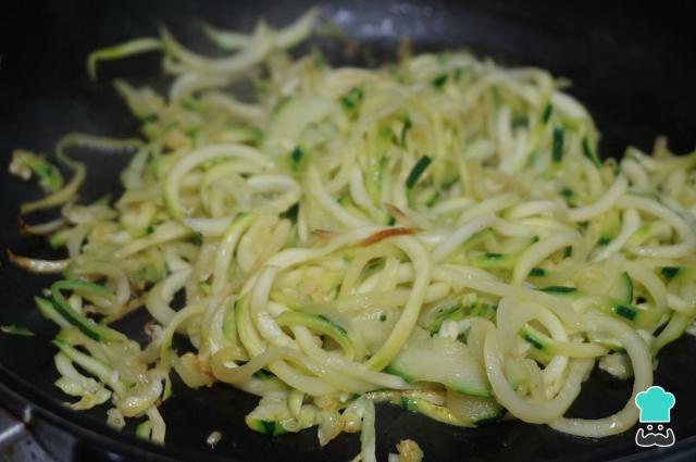 Calienta un chorro de aceite en una sartén, añadimos los espaguetis de calabacín, saltéalos y deja que se hagan unos minutos o el tiempo que consideres para que queden a tu gusto. No añadas sal todavía porque entonces los espaguetis soltarán agua y la receta de espaguetis de calabacín con atún quedará un tanto aguada. Cuando cojan un poco de color entonces podrás salarlos.