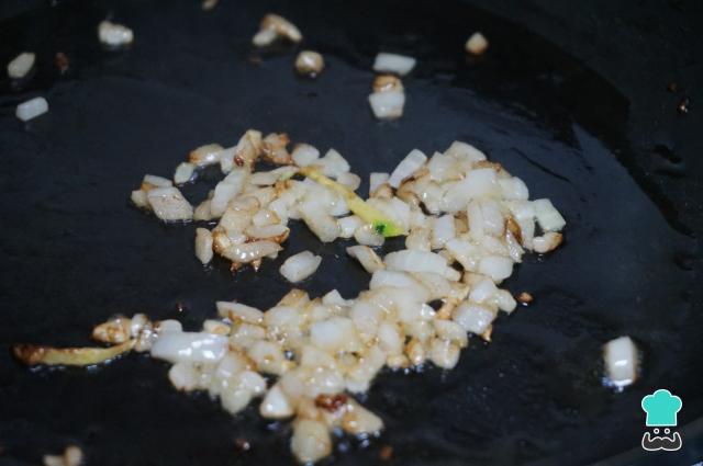 Retira los espaguetis cuando estén hechos y, en esa misma sartén, añade un poco más de aceite y pocha la cebolla picada hasta que coja un poco de color, preferiblemente a fuego medio.