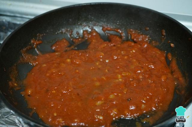 Agrega la salsa de tomate a la cebolla, un poco de pimienta, sal y orégano. También puedes picar o triturar dos tomates para hacer la receta de espaguetis de calabacín con atún todavía más ligera.