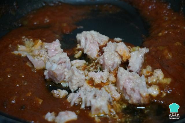Escurre el atún del aceite y añádelo a la sartén cuando esté el tomate cocinado. Rehoga todo junto, prueba de sal y pimienta y rectifica si es necesario.