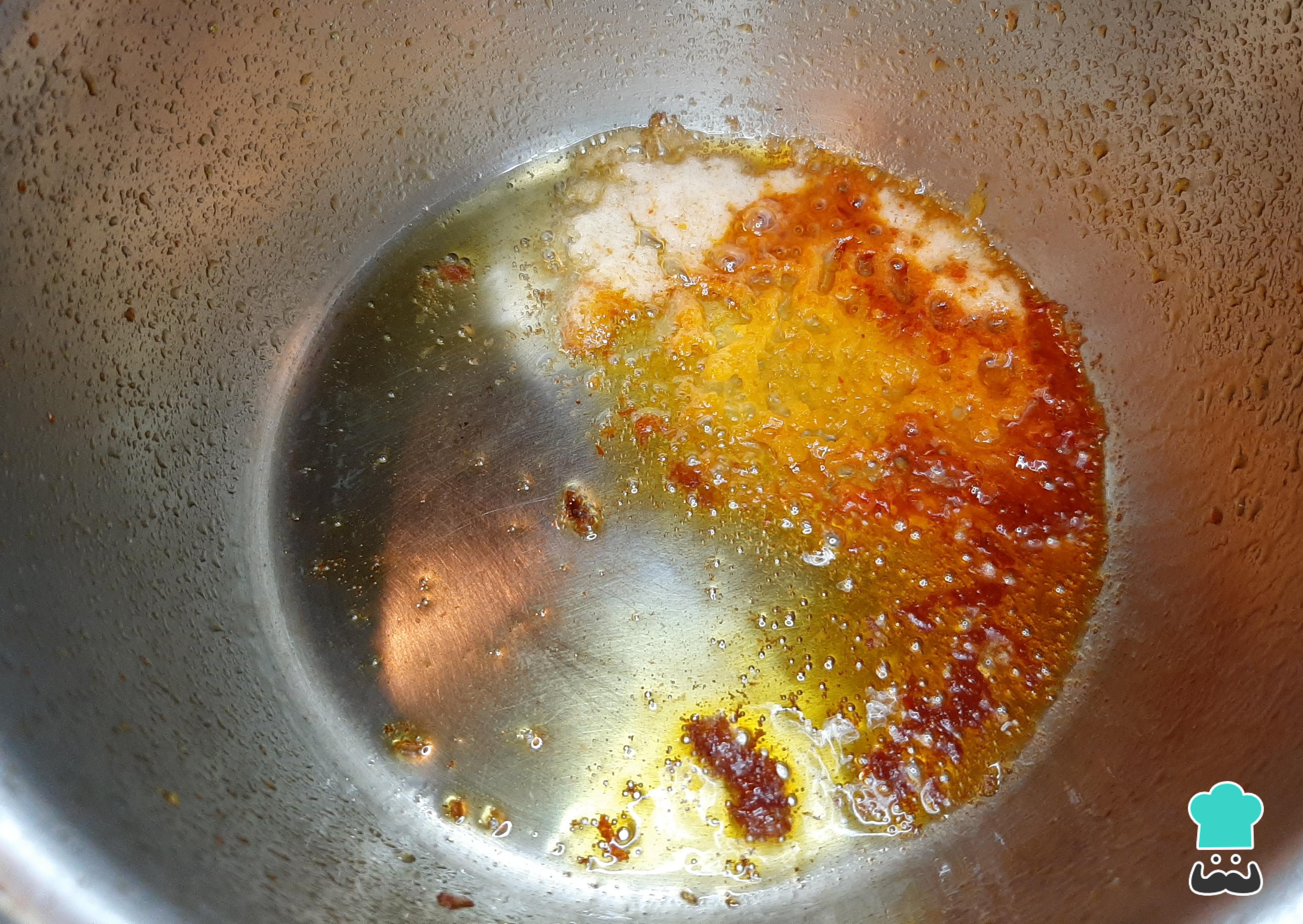 En una olla mediana a fuego medio, añade un chorro de aceite vegetal, una cucharada de ají panca molido y ají amarillo molido.