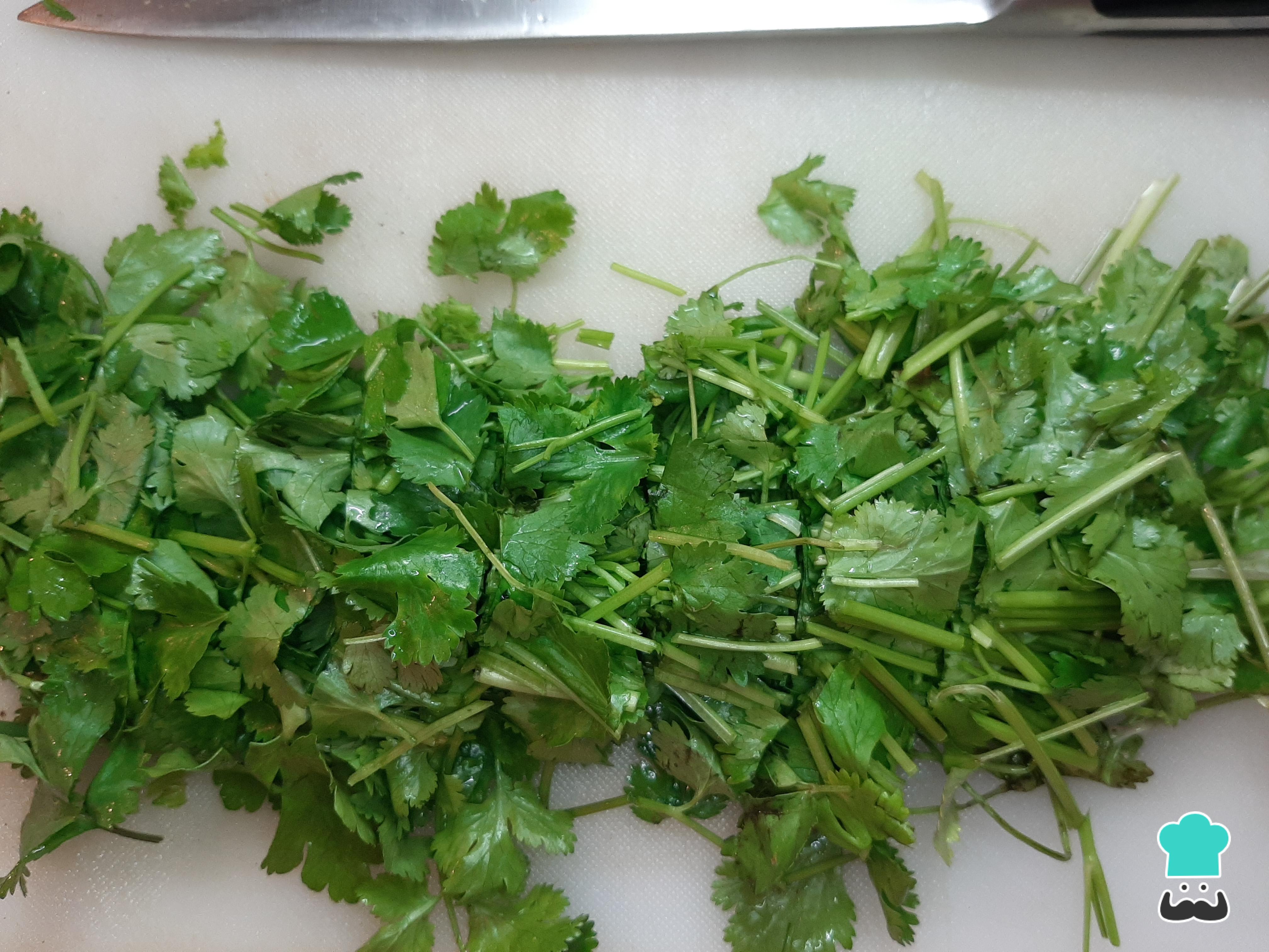 Con abundante agua, lava el cilantro y corta la raíz. Retirar las hojas y reservar algunos tallos.