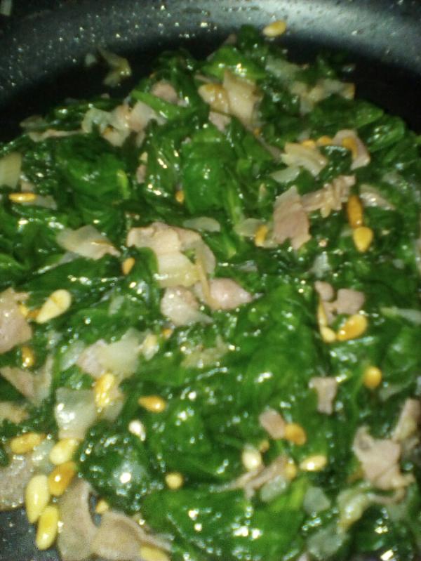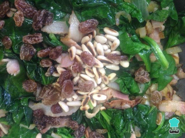 Añadimos las espinacas al sofrito de cebolleta y beicon y removemos. Las espinacas tardan poco en cocinarse, veréis que merman su tamaño rápidamente. Por último, añadimos las pasas escurridas y los piñones. Ponemos sal y pimienta al gusto.