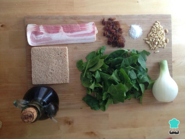 Reunimos todos los ingredientes para elaborar las espinacas a la catalana.