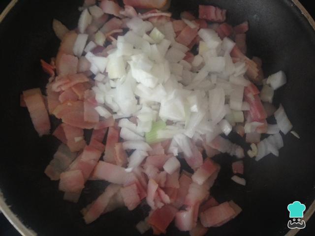 Salteamos la cebolla cortada en cuadraditos con un poco de aceite de oliva. Pasados 2 minutos añadimos el beicon cortado en tiras y dejamos que se cocine durante 3 minutos.