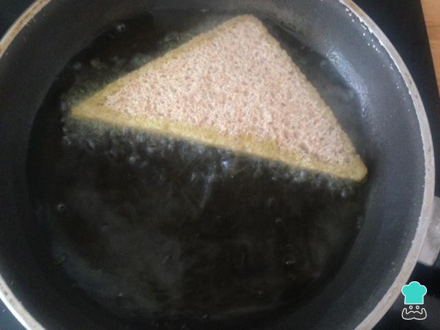 Por otra parte, freímos el pan de molde en abundante aceite hirviendo.