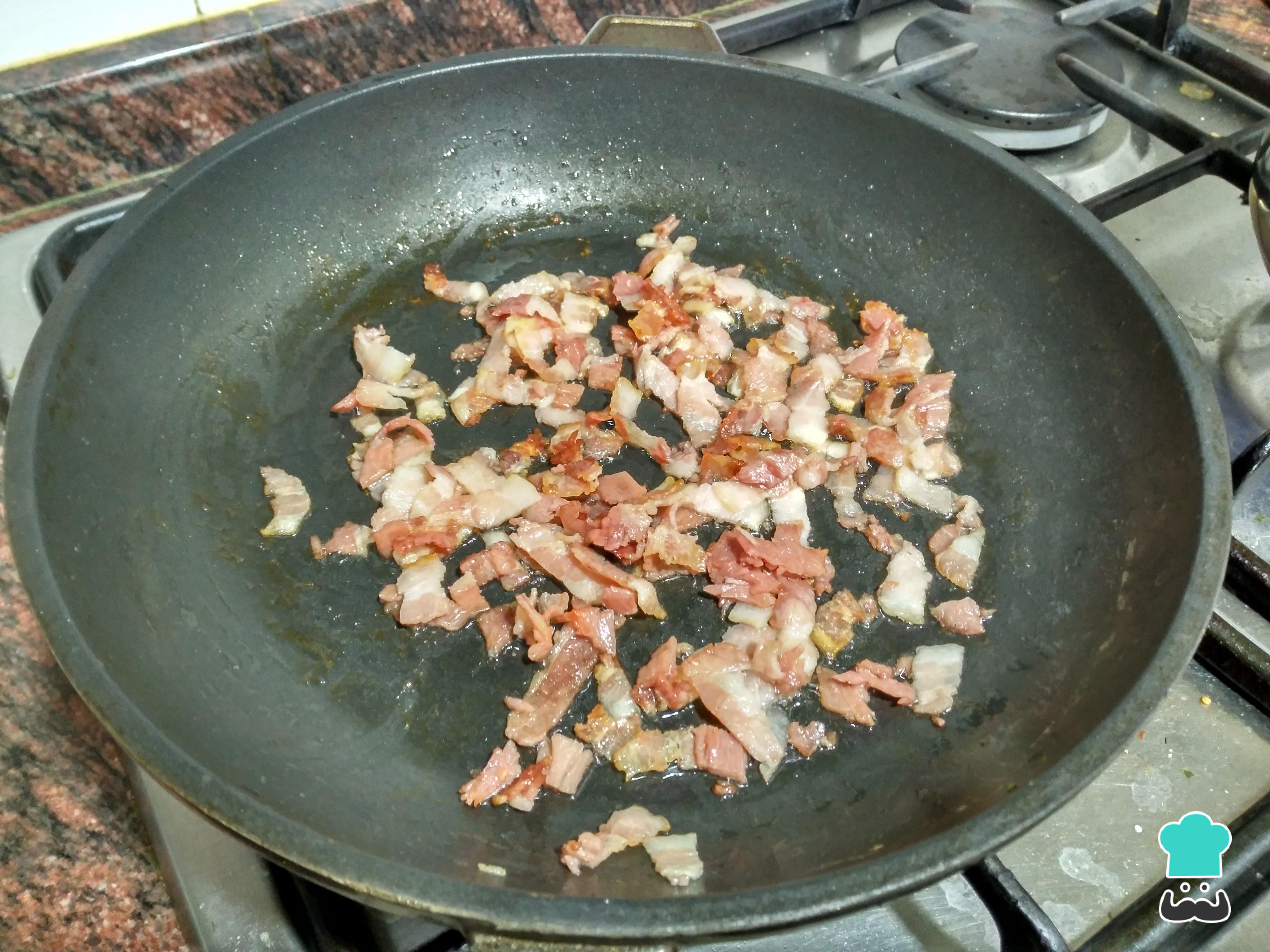 Corta el bacon el cuadrados/rectángulos finos y fríelo en una sartén sin aceite ni nada, ya que la tocineta ya tiene grasa y soltará su propio aceite, hasta que esté bien dorado. Después reserva el bacon por un lado y la sartén con la grasa por otro.