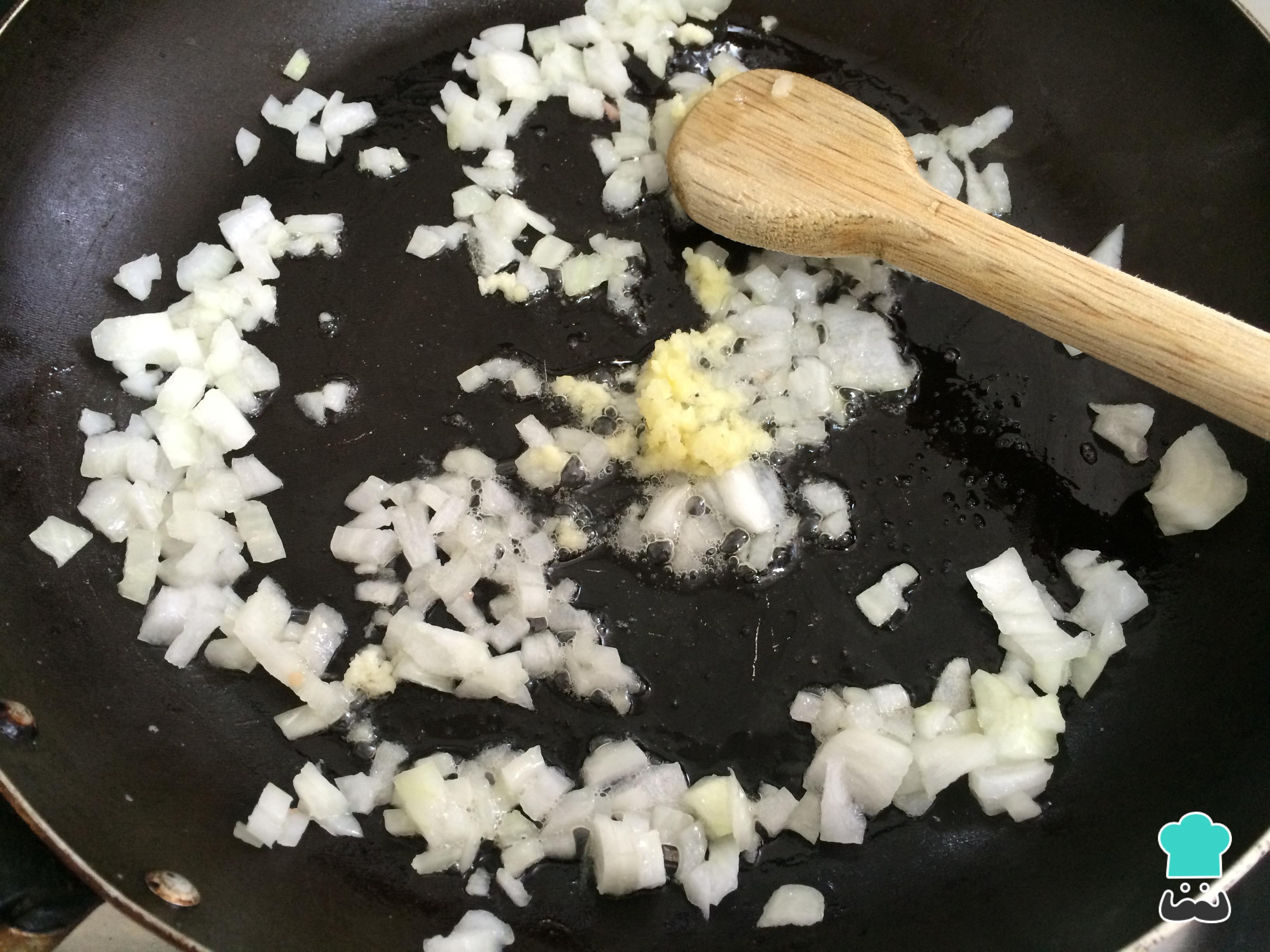 En una sartén con mantequilla sofreír la cebolla y el ajo finamente picado hasta que esté todo dorado.