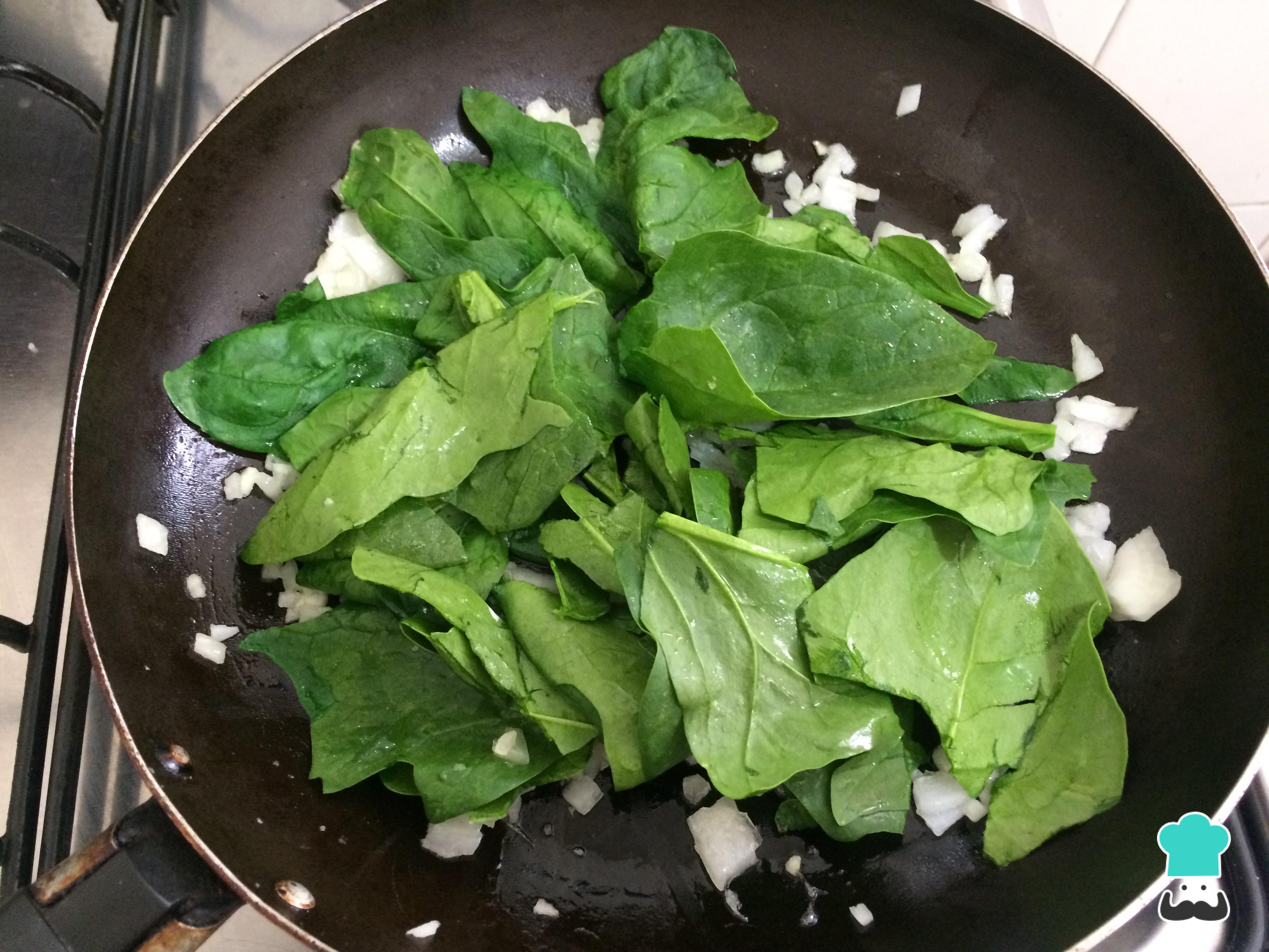 Agregar la espinaca y sofreír hasta que ésta reduzca considerablemente su tamaño.