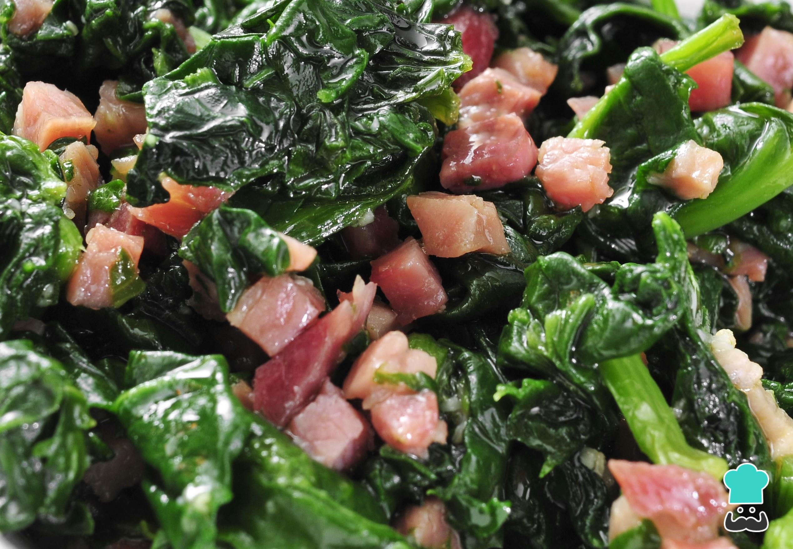 A continuación, echa un poco de aceite en una sartén, corta el jamón cocido en pequeños cuadrados y rehógalo. Luego añade las espinacas, saltéalo todo un par de minutos y resérvalo para después.