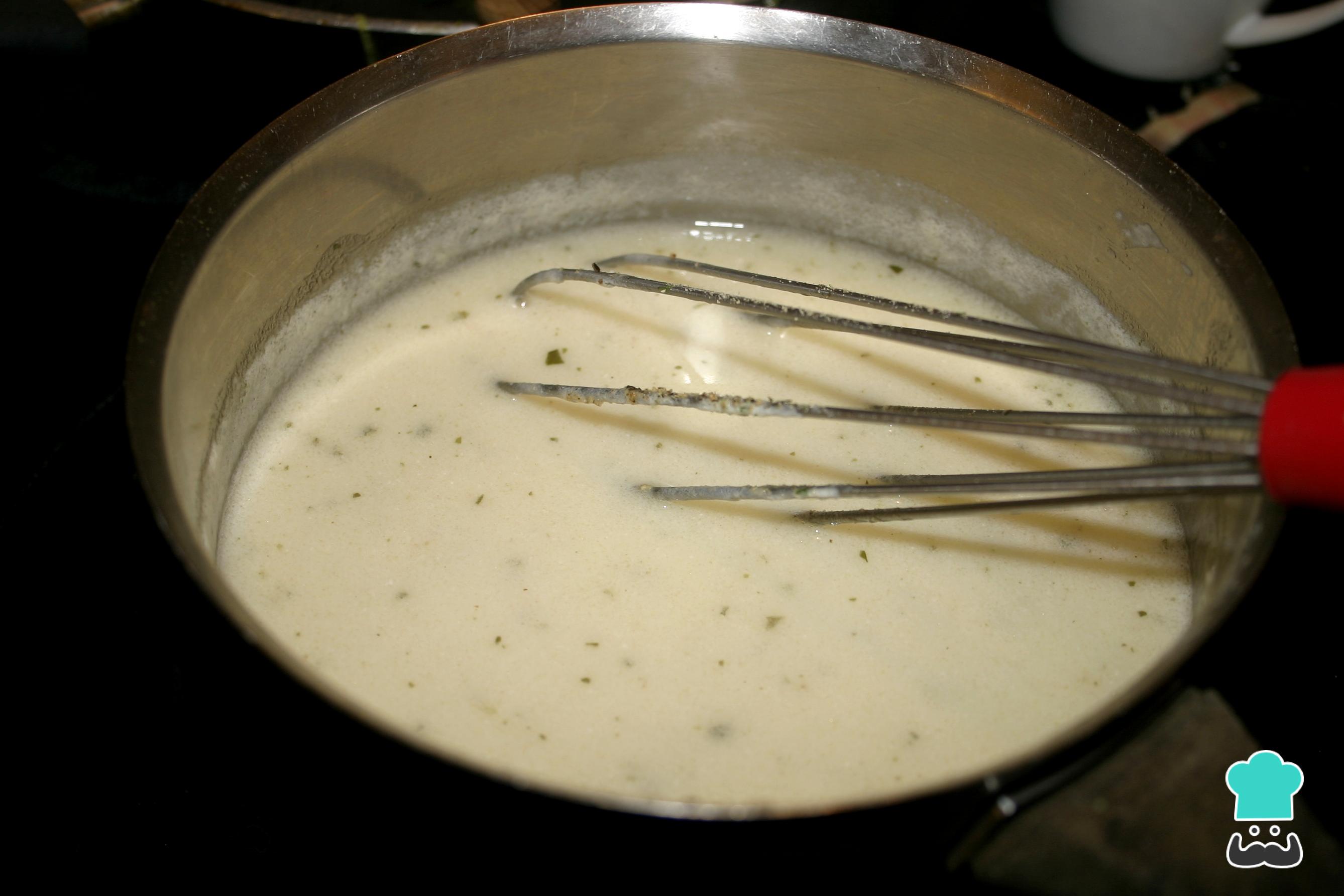 Seguidamente, haz una bechamel ligera con un poco de aceite, harina y leche, y sazónala con sal y la pimienta negra.