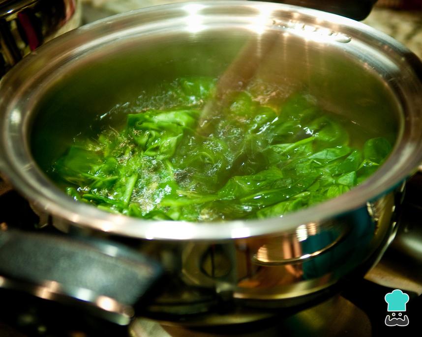 Para hacer esta receta fácil lo primero que debemos hacer es cocer las espinacas en agua hirviendo con sal, habiéndolas lavado antes.