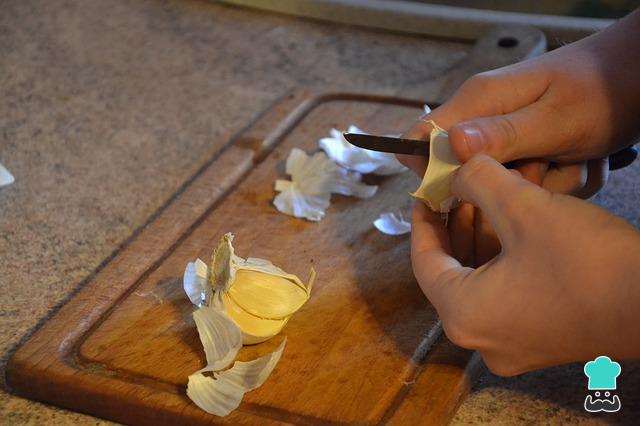 Ponemos una sartén con aceite al fuego. Cuando esté caliente, doramos los ajos fileteados moviéndolos constantemente con una cuchara de madera para evitar que se quemen.