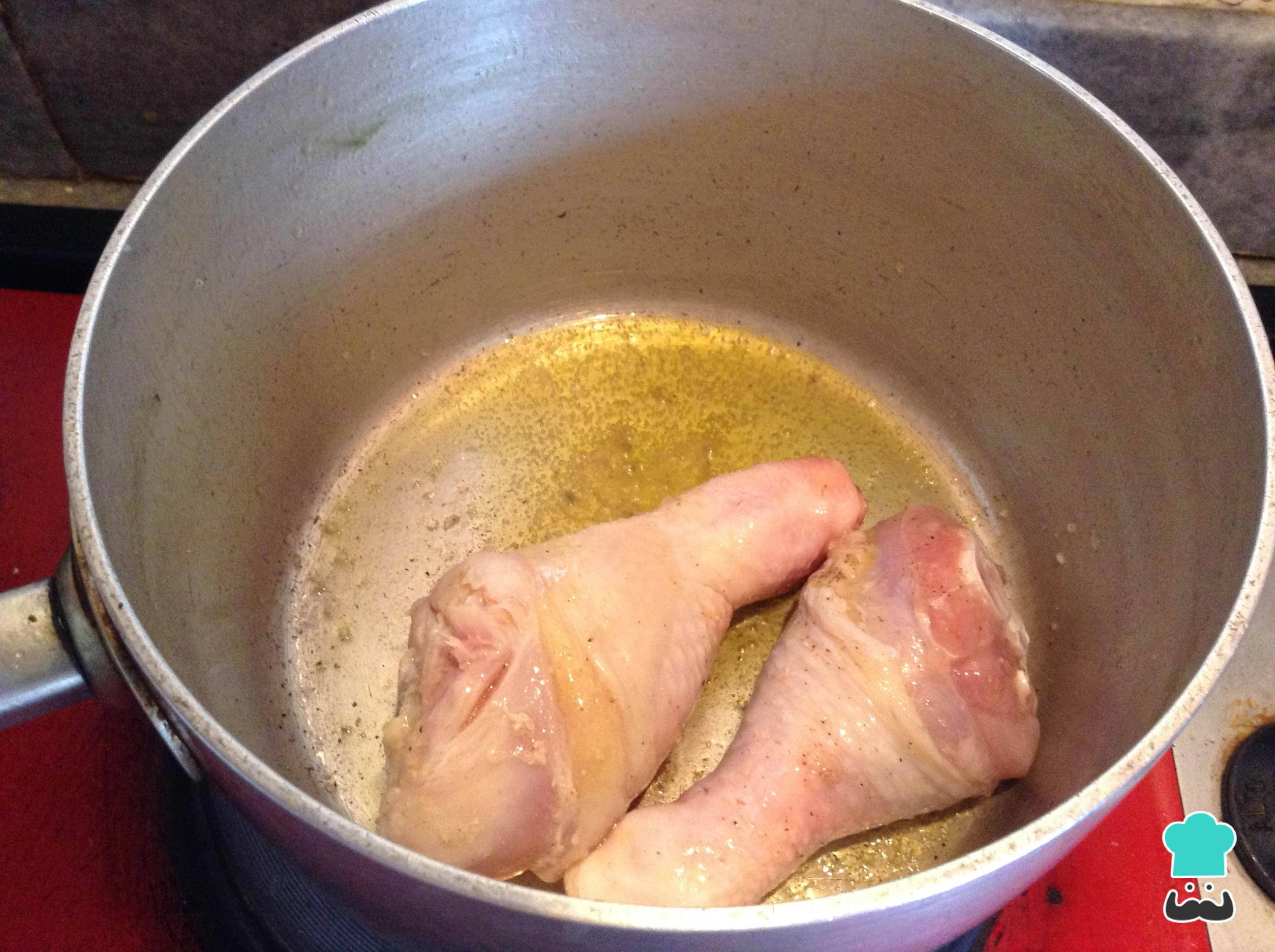Llevar una olla onda a fuego medio, añadir el aceite de oliva y los muslos. Adicionar sal y pimienta al gusto a la preparación. Sofreír el pollo durante unos cinco minutos para sellar la carne.