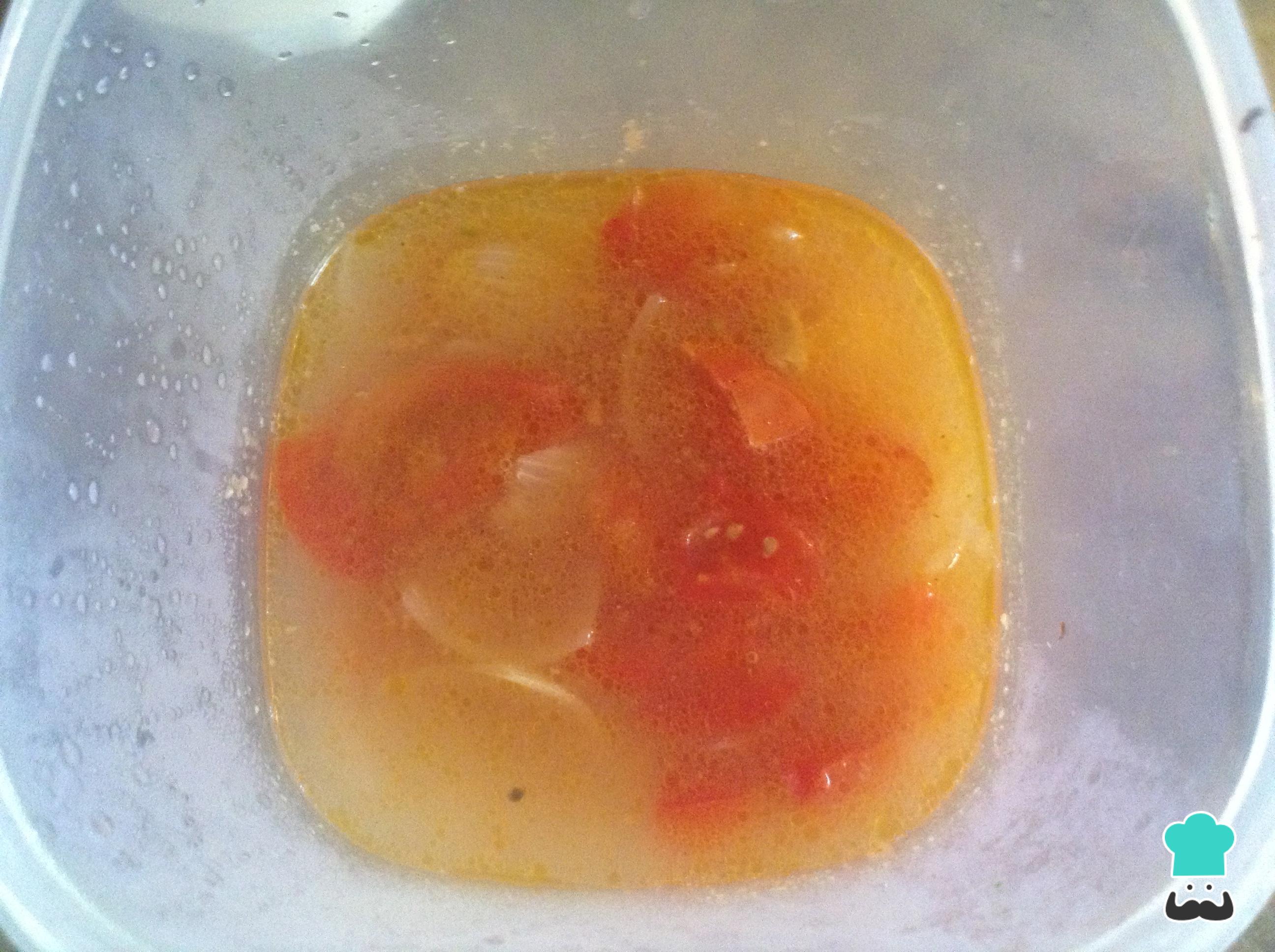 Pasado este tiempo, retirar el caldo del estofado de pollo con verduras y llévalo a un bol. Licua esto para obtener una salsa de textura homogénea.
