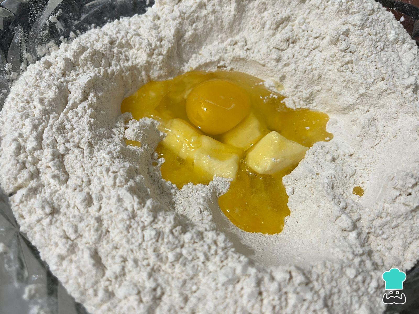 Para empezar con la preparación de las facturas con crema pastelera, primero mezcla la harina con la pizca de sal. Llévala a una mesada limpia y haz un agujero en el centro. En él, agrega el huevo, la manteca derretida, la leche tibia, el azúcar y la levadura.