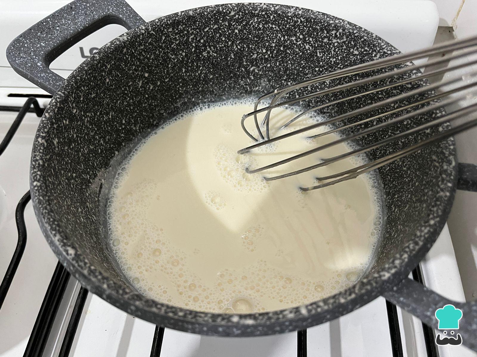 Cuando la leche esté por empezar a hervir, vuélcala en el recipiente donde mezclaste la harina con el huevo. Revuelve hasta integrar y lleva la preparación a la olla nuevamente a fuego medio. Remueve y cocina hasta que espese.