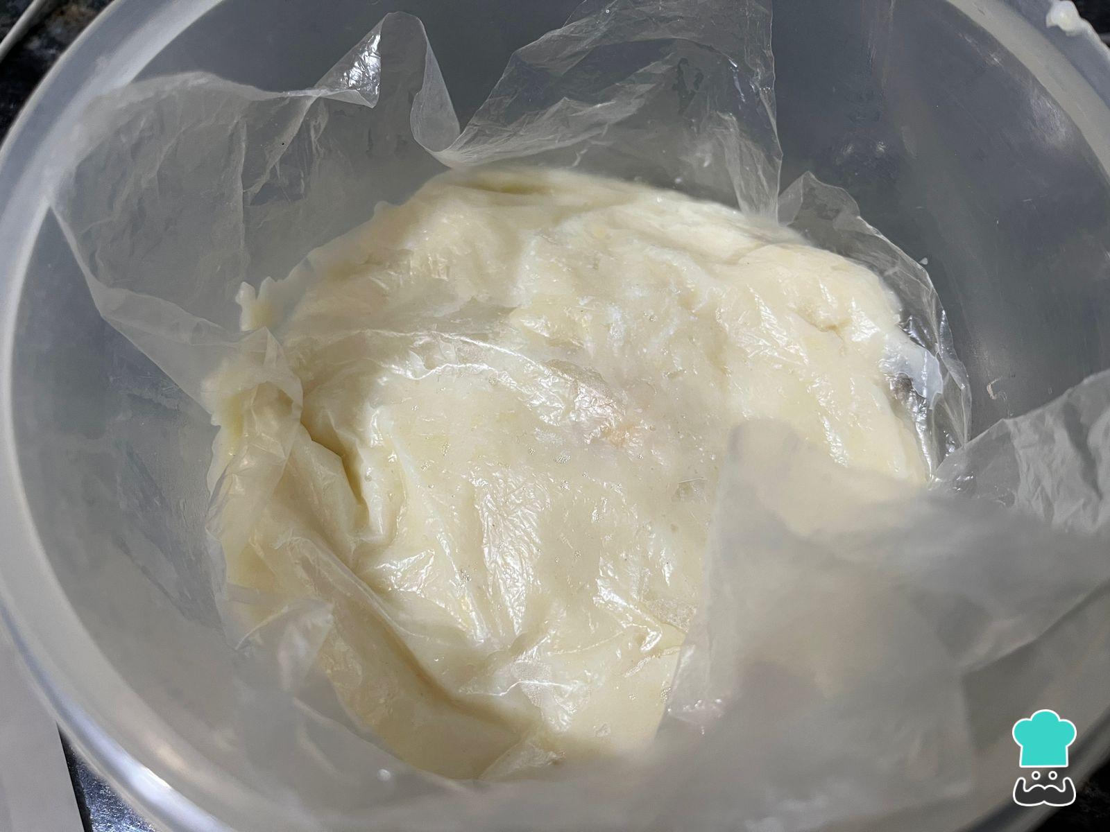Reserva la crema pastelera en un recipiente tapado conpapel de plástico, debe entrar en contacto con la preparación. Esto evitará que se forme una capa espesa encima.