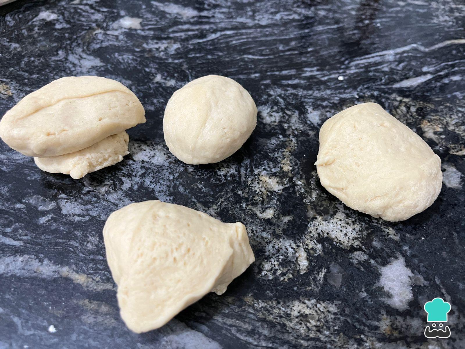 Pasado el tiempo de leudado de la masa de las facturas con crema pastelera, divídela en bollitos de aproximadamente 40 gramos. Si no tienes balanza, serán del tamaño de una pelota de golf.
