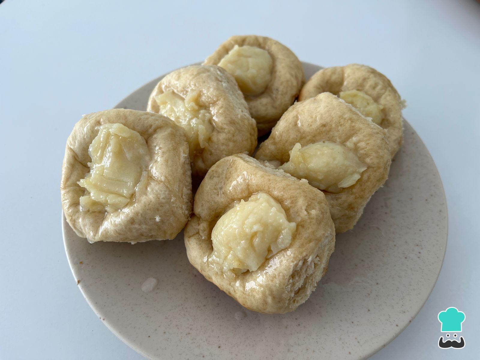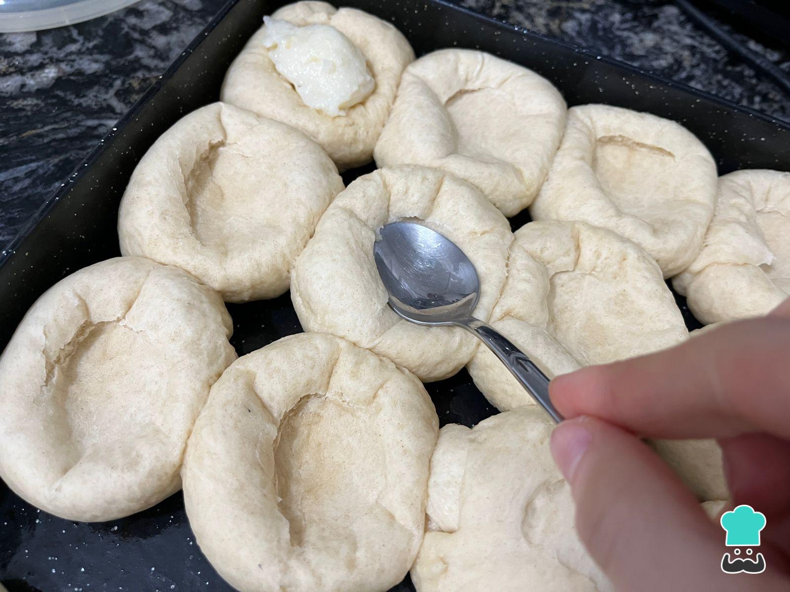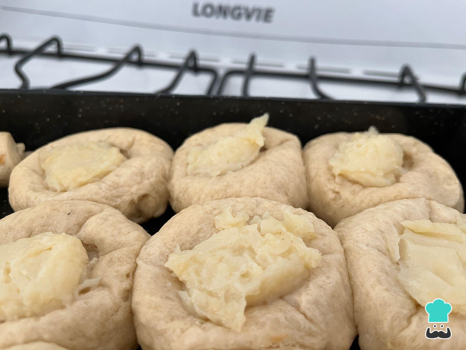 Lleva los bollitos a una asadera engrasada proporcionando la forma cuadrada característica de estas facturas, tápalas para que leuden nuevamente. Enciende el horno para que se precaliente y favorezca este segundo leudado. Cuando hayan crecido, haz un hueco en el centro con ayuda de una cuchara. Dispón la crema pastelera en una manga o rellénalas con ayuda de una cuchara.