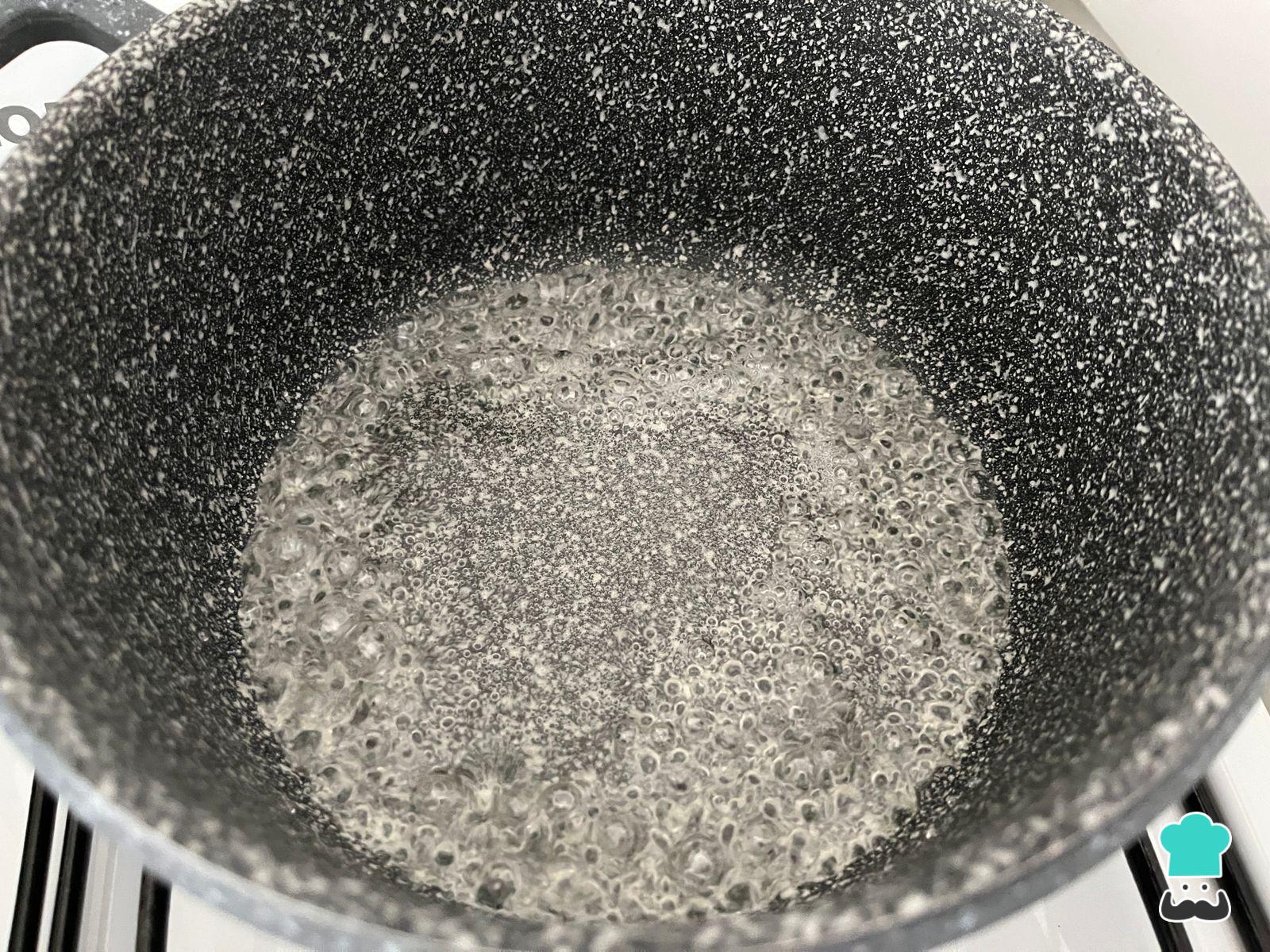 Mientras se cocinan, disuelve el azúcar en el agua y lleva a una olla de diámetro chico y alta. Enciende el fuego a temperatura media y no lo muevas hasta que se formen burbujas grandes en toda la superficie, como ves en la imagen. Alcanzará unos 118 ºC si tienes termómetro para medirlo.